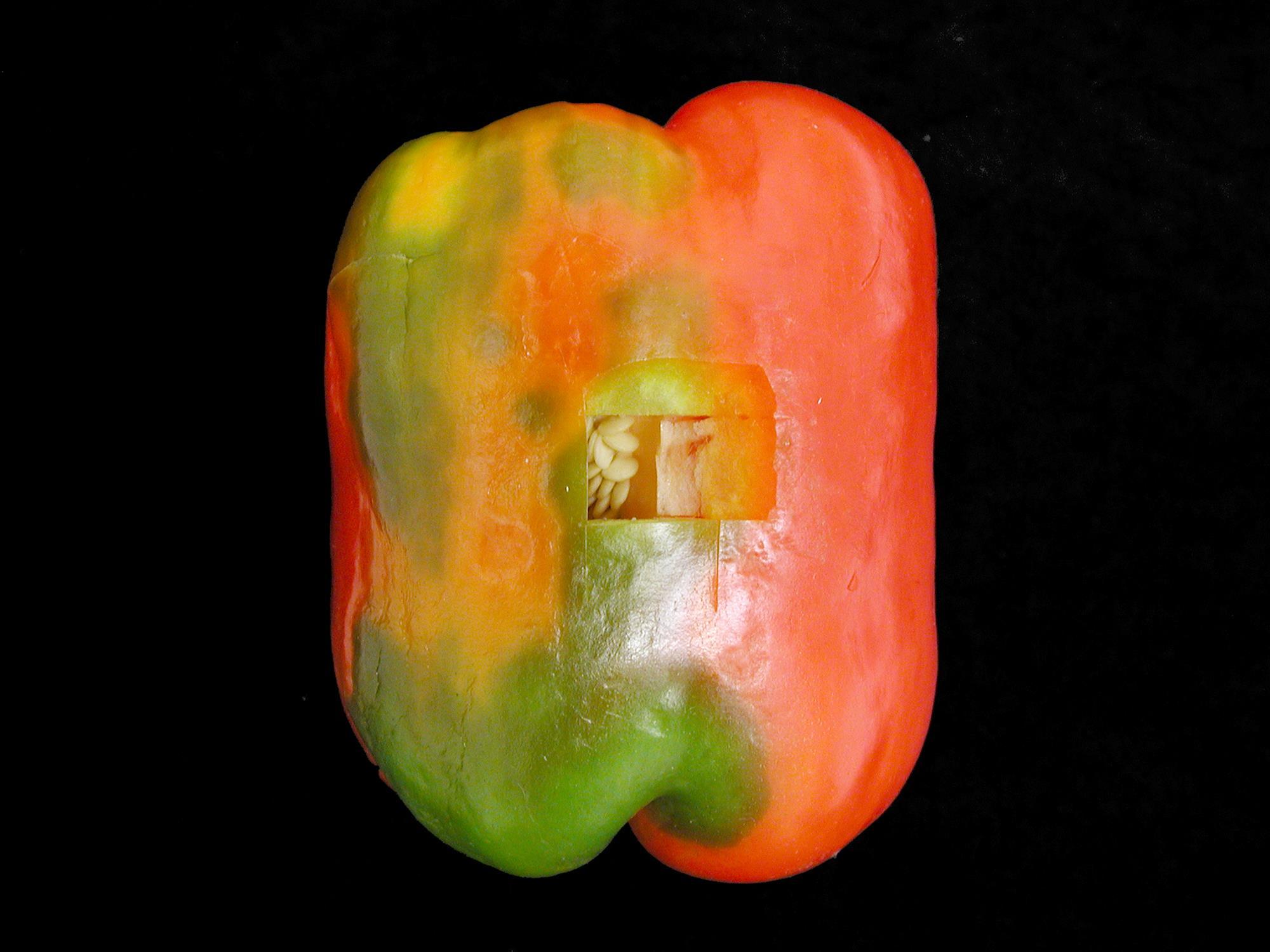 Description: Un poivron de champ montre une moitié verte et une moitié rouge. Sur la partie rouge, des taches circulaires vertes sont visibles. La partie coupée sur l’épiderme montre une chair intacte. Les tests de laboratoire ont révélé la présence du virus de la mosaïque du concombre (CMV).