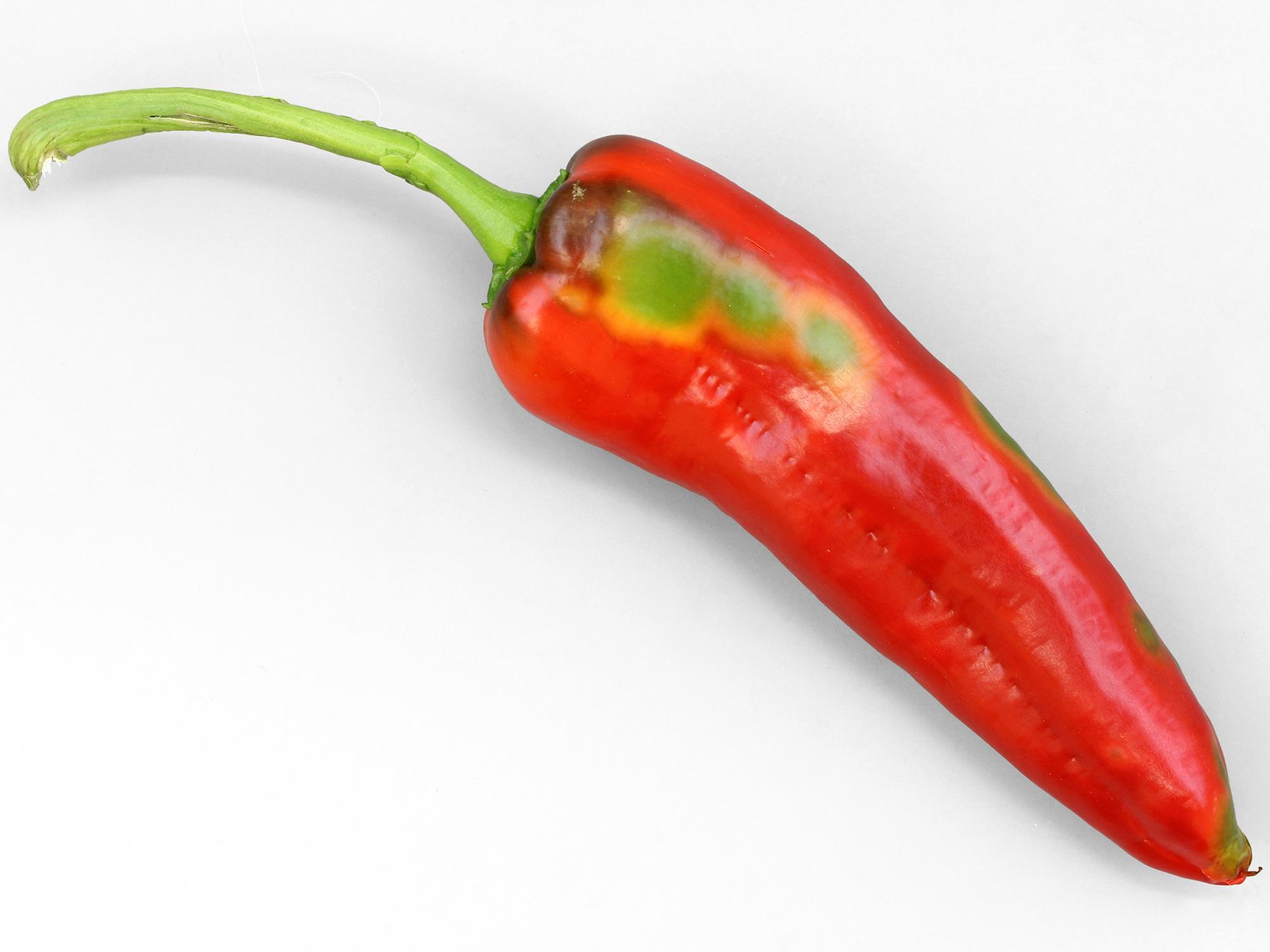 Description: L’épiderme d’un poivron de serre (cv 'Ramiro') montre de grosses taches circulaires vertes avec un halo jaune. Les tests de laboratoire ont révélé la présence du virus de la tache nécrotique de l’impatiente (INSV).