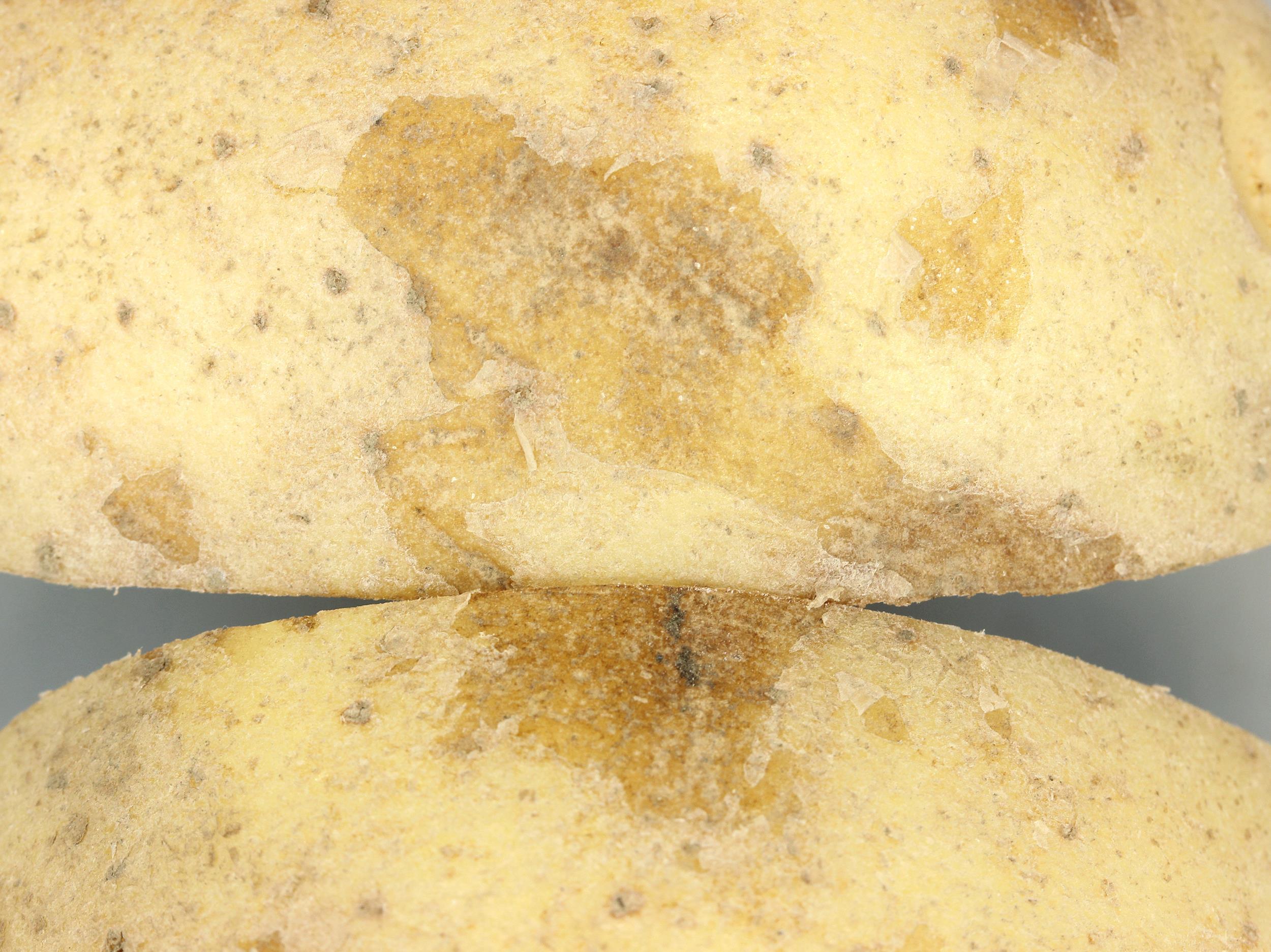 Description: Une vue rapprochée des tubercules de pomme de terre (cv 'Valor') provenant d’un entrepôt montre des taches brunâtres sur le périderme. Des nécroses annulaires composées de lignes et d’arcs bruns sont également présentes dans la chair. Les tests de laboratoire ont révélé la présence du virus du sommet touffu de la pomme de terre (Potato Mop-Top virus (PMTV)).