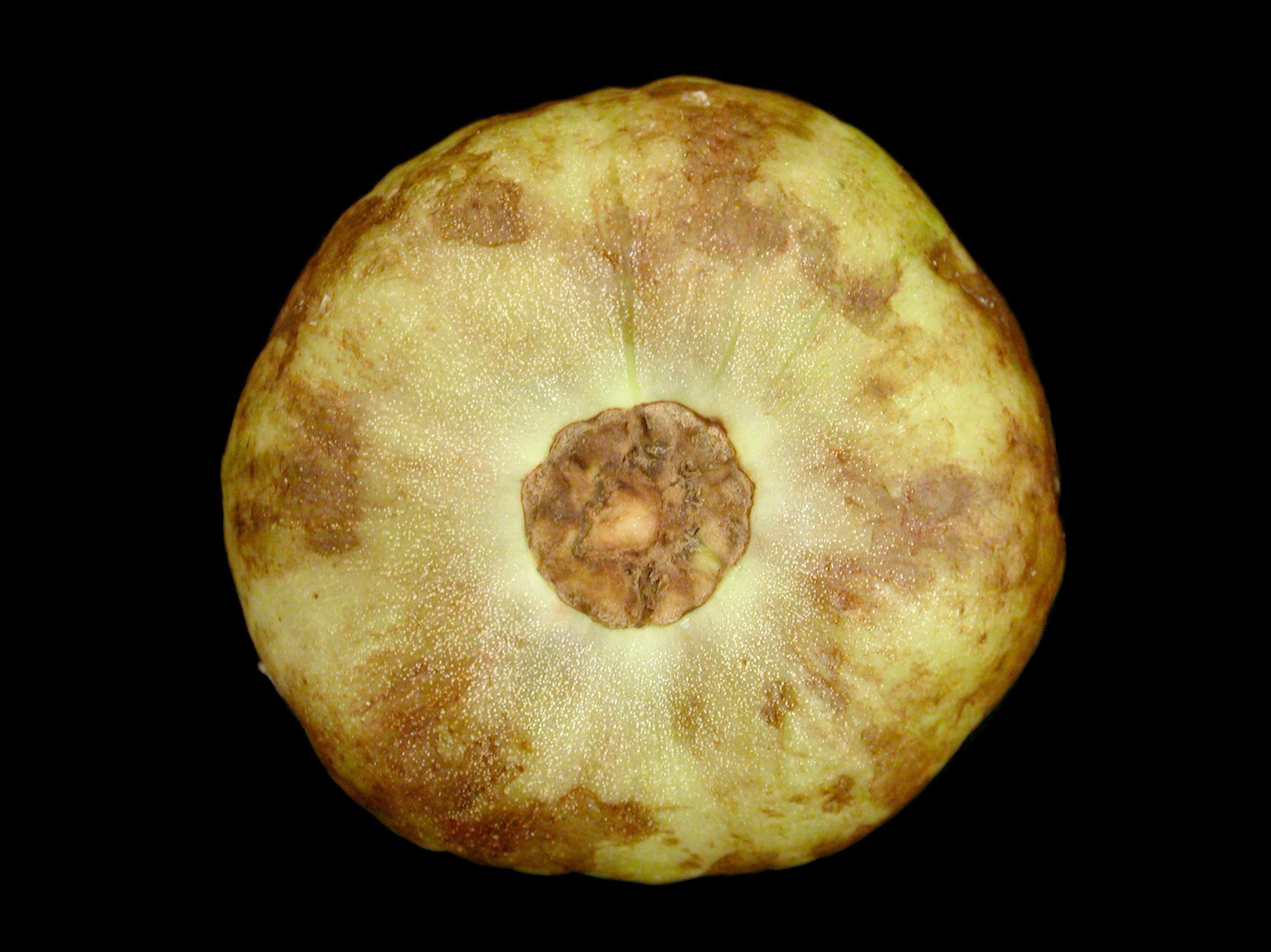 Description: L’épiderme d’une tomate de champ montre des taches brunes déprimées, d’une forme variable. La surface prend une apparence bosselée. La zone pédonculaire ne montre pas de symptôme. Les tests de laboratoire ont révélé la présence du virus de la mosaïque de la luzerne (AMV).