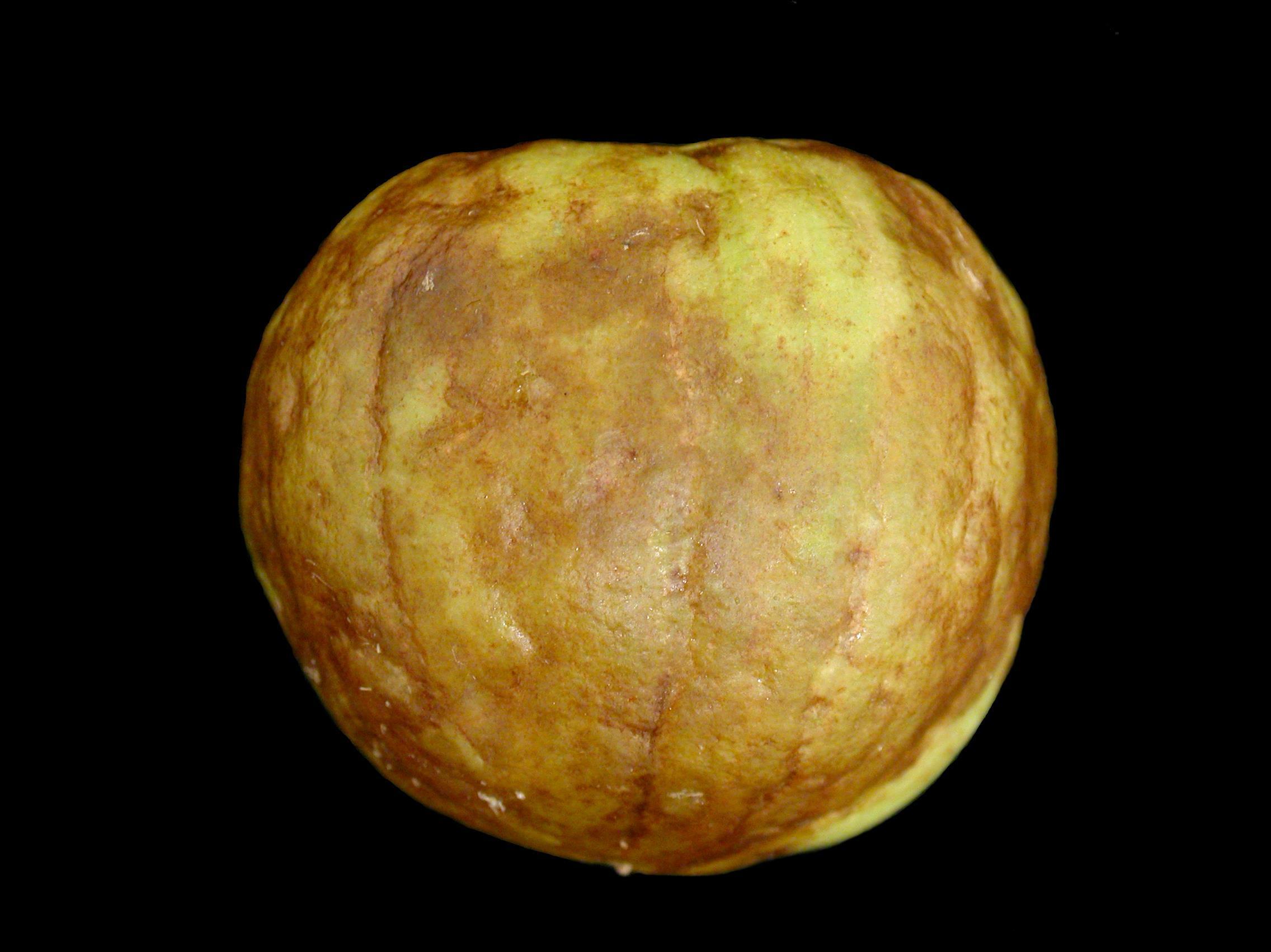 Description: L’épiderme d’une tomate de champ montre de grandes taches brunes déprimées, d’une forme variable. La surface prend une apparence bosselée et la malformation occupe une proportion importante de l’épiderme. Les tests de laboratoire ont révélé la présence du virus de la mosaïque de la luzerne (AMV).