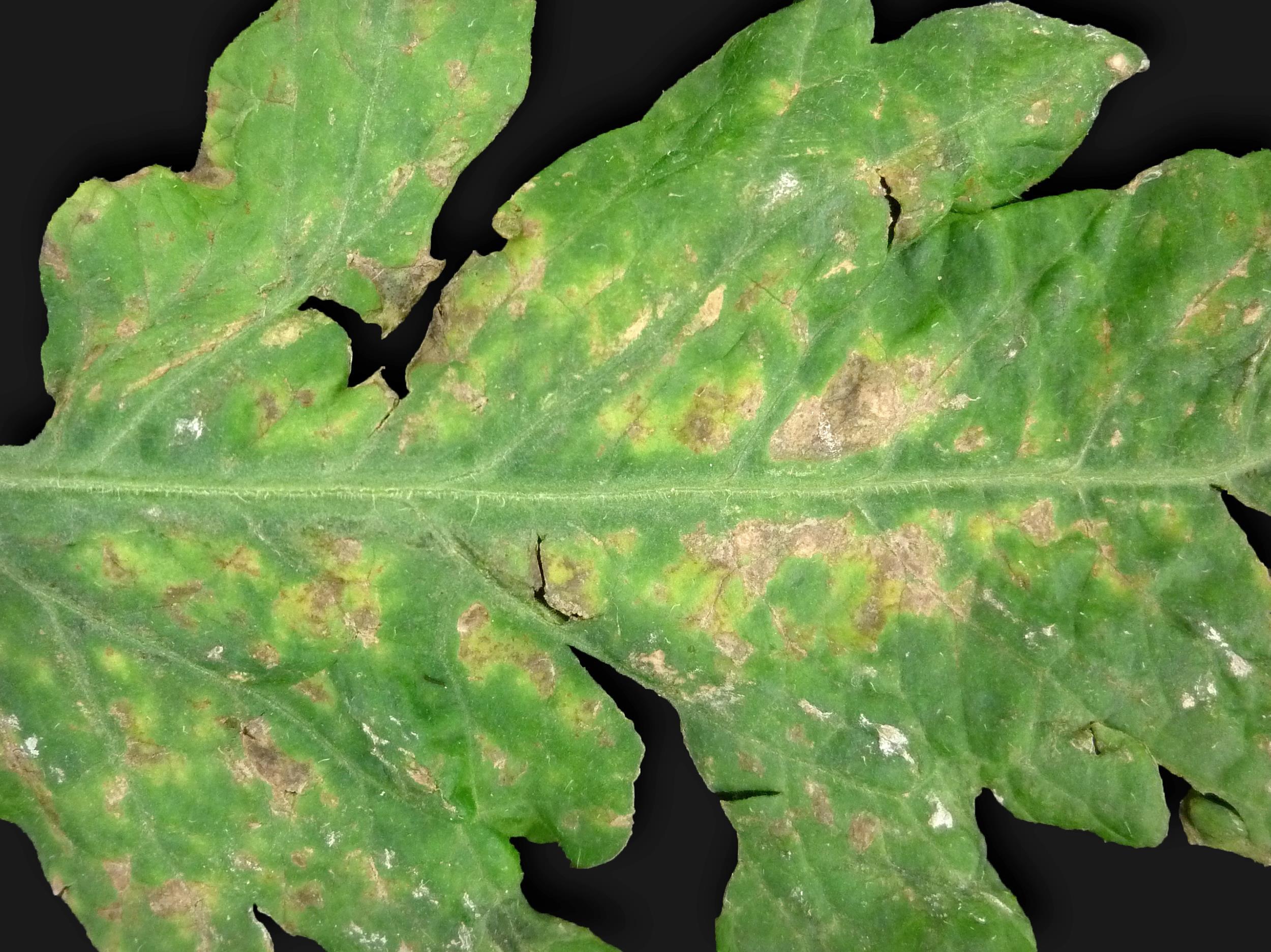 Description: Une vue rapprochée d’une foliole de tomate de serre (cv 'Trust') montre une mosaïque jaune et vert pâle débutant dans la partie basale de la foliole. Des brûlures sont visibles dans les zones avec des anomalies de coloration. Les tests de laboratoire ont révélé la présence du virus Y de la pomme de terre (PVY).