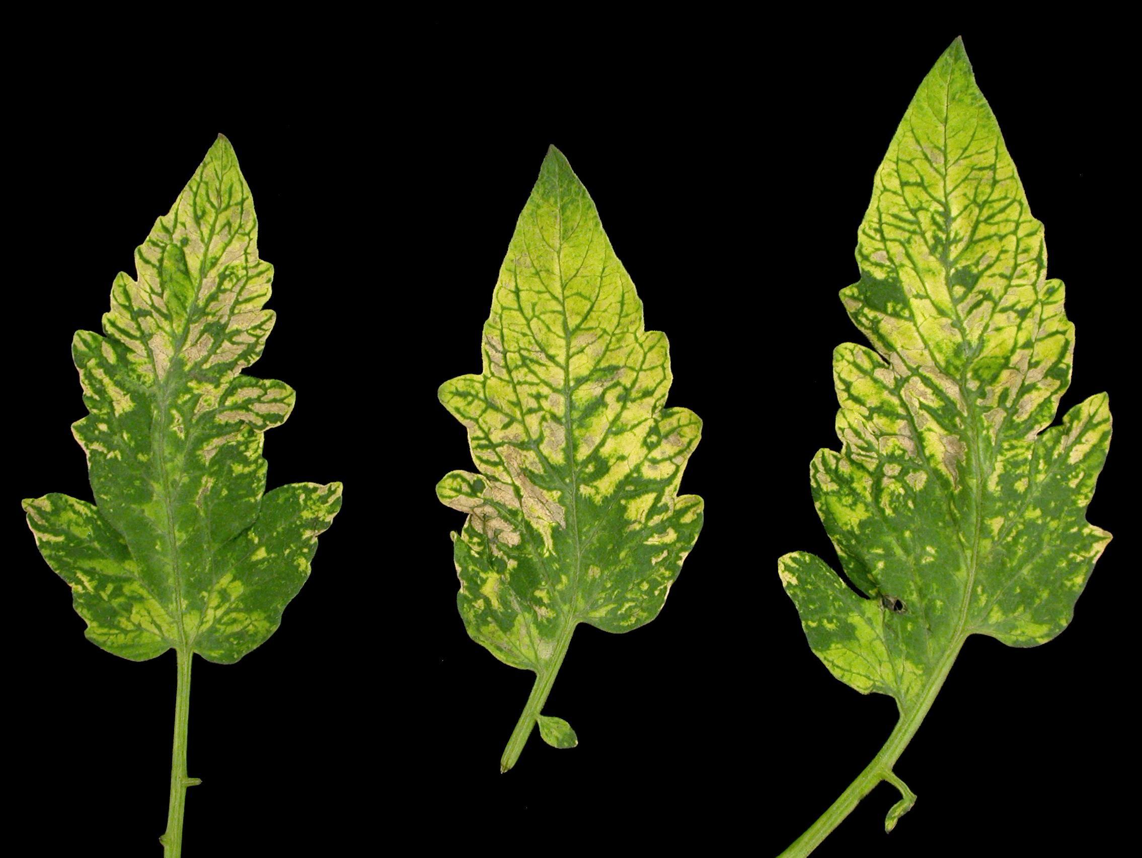 Description: Des folioles de tomate de serre (cv 'Clermont') montrent un jaunissement vif situé entre les nervures, à l’apex des folioles, une marbrure vert pâle dans la partie basale et des brûlures beige rosé au centre des folioles. Les tests de laboratoire ont révélé la présence du virus de la mosaïque du pépino (PepMV).