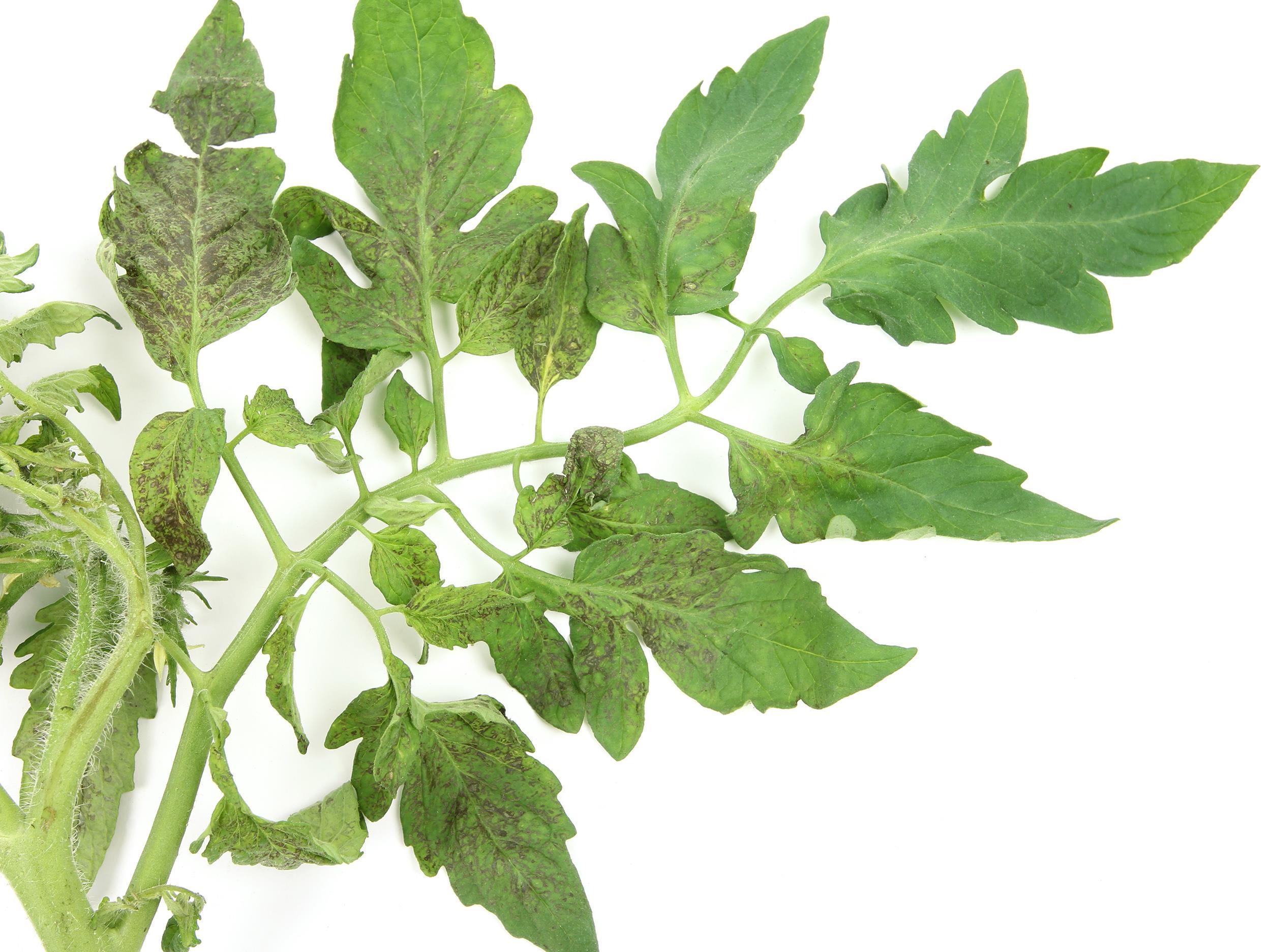 Description: Une feuille de tomate de serre montre des taches angulaires brunes et quelques anneaux bruns, débutant à la base des folioles et progressant sur le limbe. Tous les niveaux de feuille étaient affectés. Les tests de laboratoire ont révélé la présence du virus de la maladie bronzée de la tomate (TSWV).