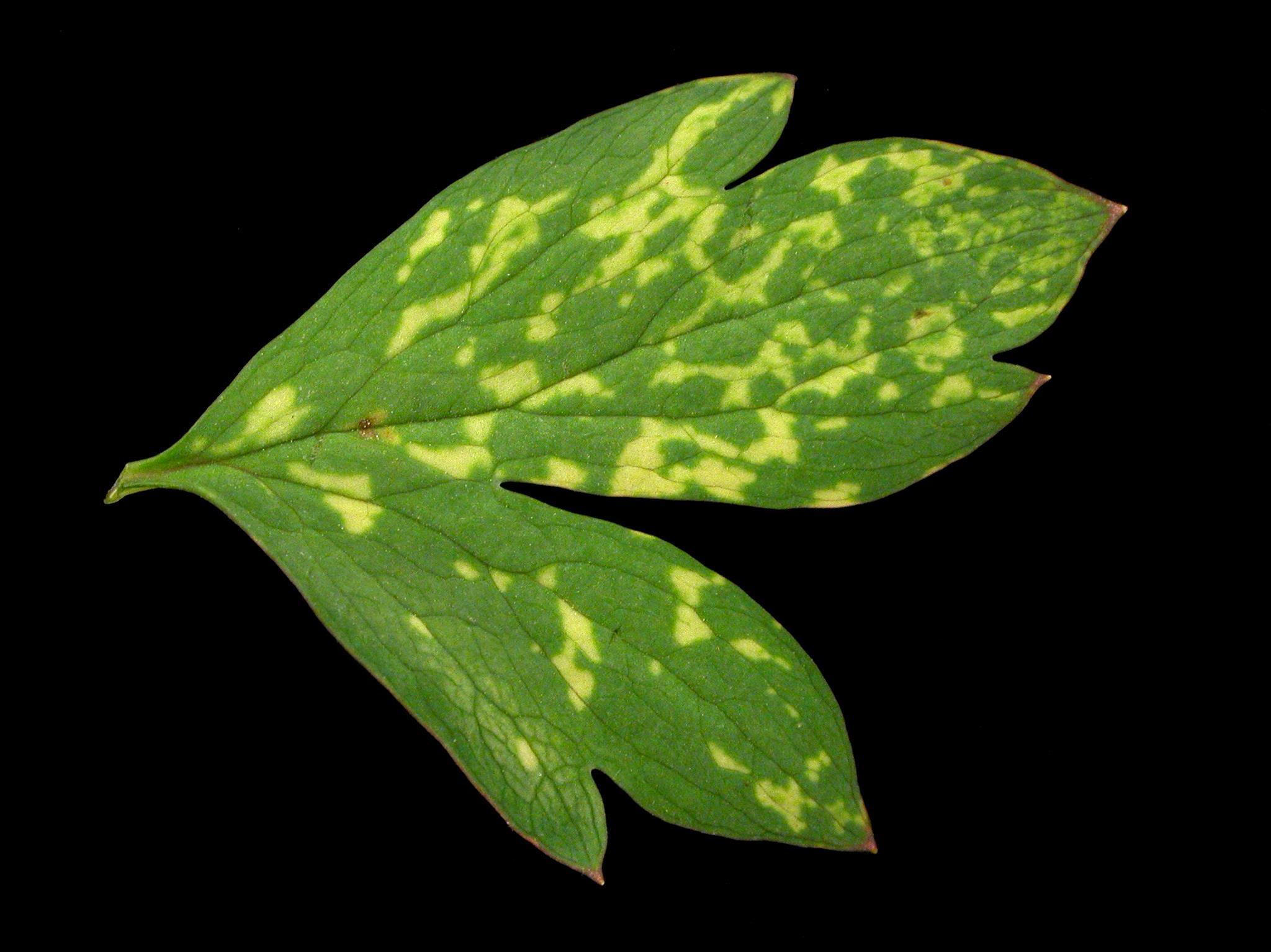 Description: Une foliole d’un cœur saignant montre un jaunissement du limbe qui se manifeste sous la forme de taches, de lignes ou d’anneaux incomplets. Les tests de laboratoire ont révélé la présence du virus du bruissement du tabac (TRV). Notez que le virus des taches en anneaux du tabac (TRSV) n’a pas été détecté dans les feuilles.