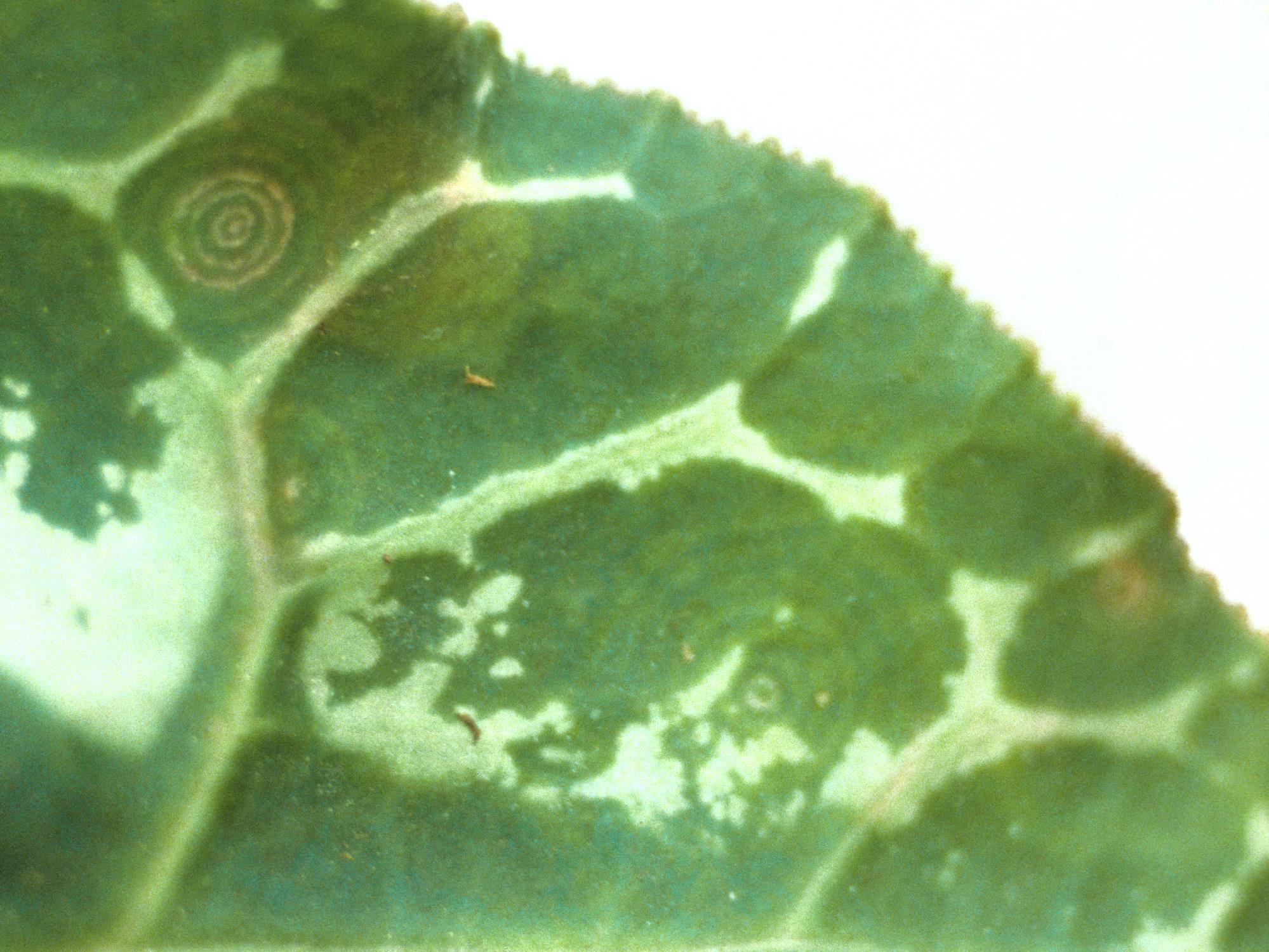 Description: Une vue rapprochée d’une feuille de cyclamen de Perse montre des taches en anneaux concentriques vert pâle (plus discrètes) à bruns. La nature des symptômes et la présence de thrips sur les feuilles ont permis de déterminer que le virus de la tache nécrotique de l'impatiente (INSV) était responsable des dommages observés sur ce plant.