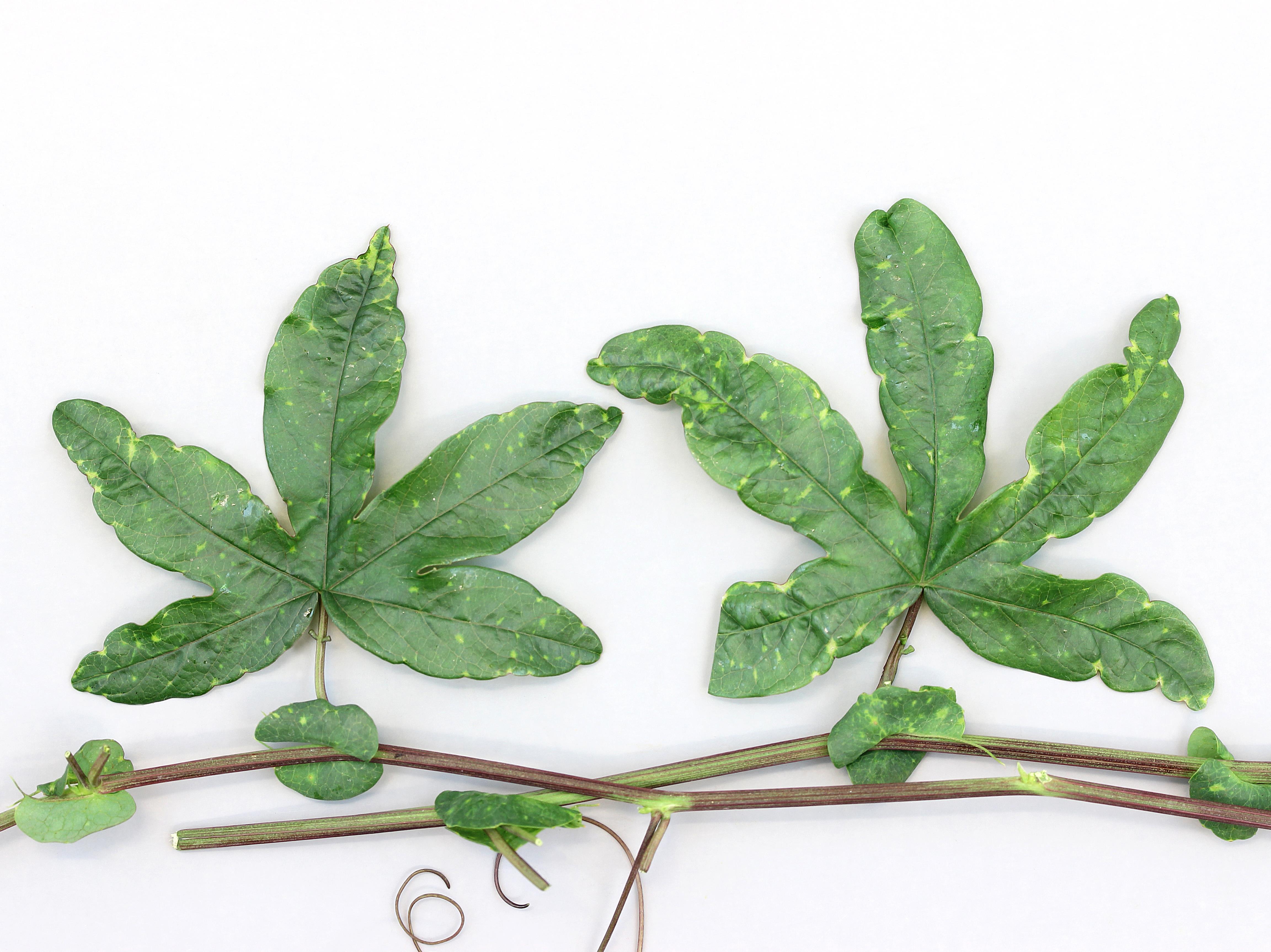 Description: À la face supérieure des feuilles de passiflore, présence de petites taches irrégulières jaunes localisées sur ou près des nervures. Les taches sont translucides lorsqu’elles sont observées à contre-jour. La marge des feuilles est parfois rétrécie, ce qui cause le gaufrage du limbe. Tous les niveaux de feuilles sont affectés. Les tests de laboratoire ont révélé la présence du virus de la mosaïque du concombre (CMV).