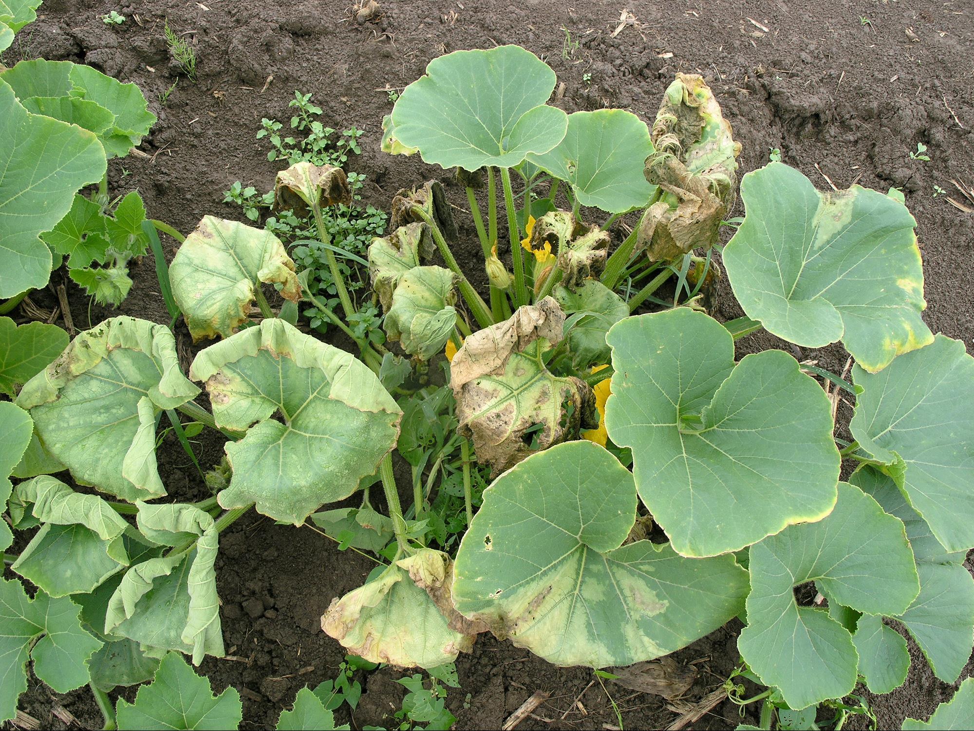 Au champ, près de 50 % des plants de courges présentent ces symptômes. Cette culture est entourée de champs de maïs grain qui sont infestés de chrysomèles. Même si le producteur a fait un traitement insecticide contre ces insectes en début de saison, les symptômes sont quand même apparus sur les plants.