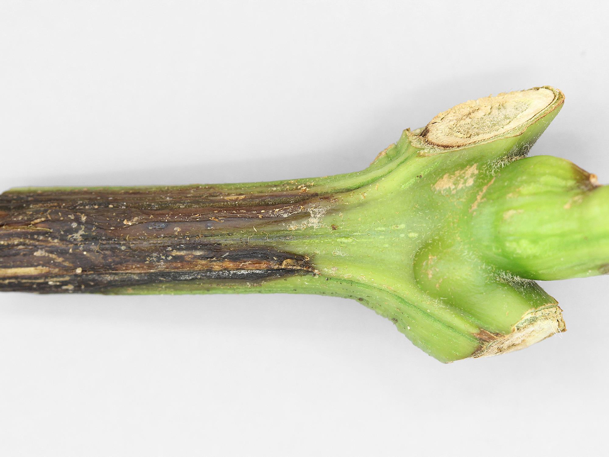 Description: La partie basale de la tige d’un plant de poivron porte un chancre brun à noir. Le système vasculaire de la tige est brun et la moelle est dégradée (non visible ici). Le feuillage était complètement flétri. Les tests de laboratoire ont révélé la présence de la bactérie Pectobacterium sp., responsable de la pourriture molle bactérienne chez le poivron. Il s’agit probablement de Pectobacterium carotovorum.
