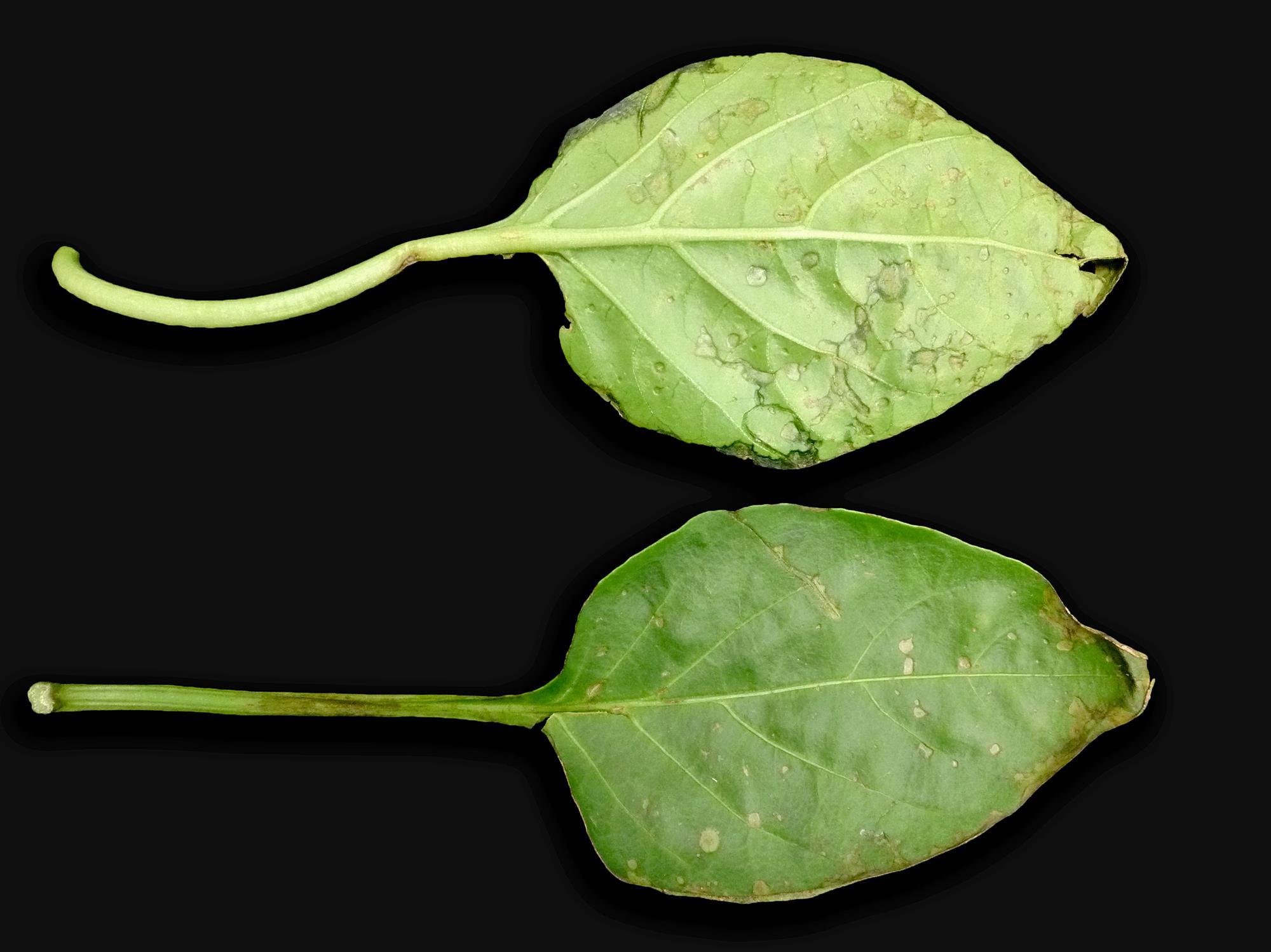 Description: À la face inférieure et supérieure des feuilles de poivron de champ, présence de taches plutôt circulaires, jaune verdâtre à beiges, dont certaines sont surélevées. Les tests de laboratoire ont révélé la présence de la bactérie Clavibacter michiganensis subsp. michiganensis, responsable du chancre bactérien. Notez que la moucheture bactérienne (Pseudomonas syringae) a été détectée des taches irrégulières brunâtres observées à la marge des feuilles.
