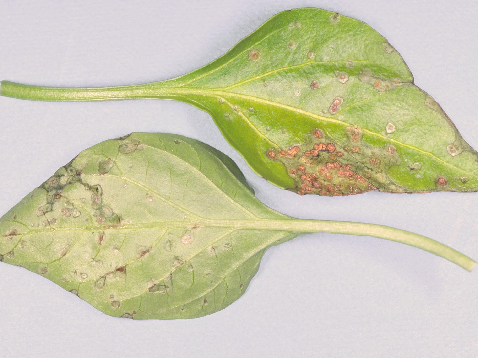 Description: Comparaison de taches aux faces inférieure et supérieure de feuilles de plantules de poivron de serre. À la face inférieure les taches sont petites, circulaires d’un diamètre moyen se situant entre 1 et 2 mm. Au début, les taches sont blanchâtres avec un petit point brun au centre. Les taches deviennent brunâtres et prennent une apparence liégeuse. Absence d’un halo jaune. Les taches ont une apparence sèche. Les taches à la face inférieure sont similaires, mais ne sont pas encore liégeuses. Les tests de laboratoire ont révélé la présence de la bactérie Clavibacter michiganensis subsp. michiganensis, responsable du chancre bactérien.