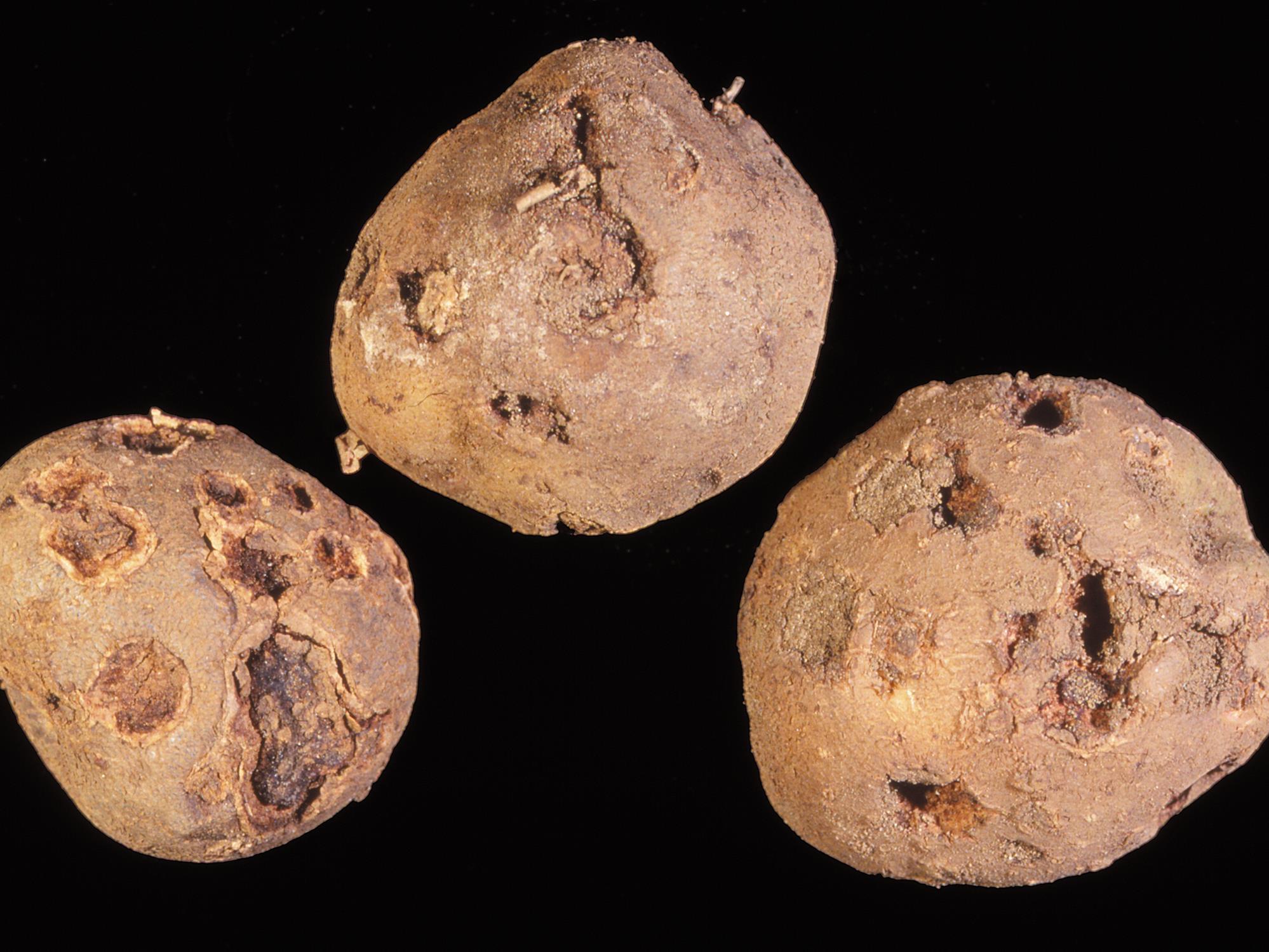 Description: Sur des tubercules de pomme de terre provenant d’un champ, présence de dépressions pénétrant dans la chair et de zones chancreuses irrégulières, beiges à brunes, d’une apparence sèche et liégeuse. Selon un laboratoire indépendant, il s’agit de la gale profonde causée par la bactérie Streptomyces scabies, responsable de la gale commune chez la pomme de terre.