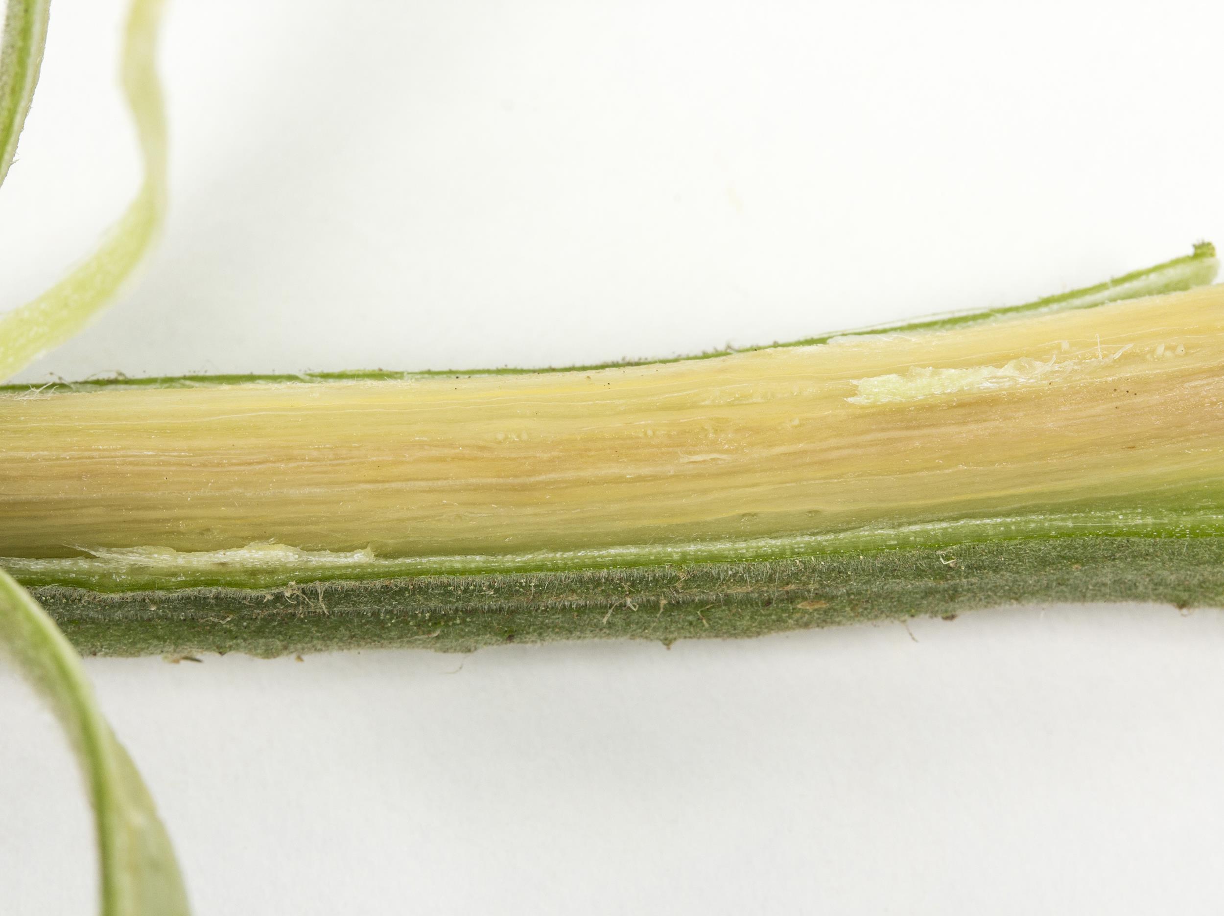 Description: Une tige de tomate de serre pelée de son épiderme montre des vaisseaux conducteurs bruns. Le collet exhibait des symptômes similaires. Les feuilles médianes et terminales portaient des plages brûlées localisées entre les nervures (non visible ici). Les tests de laboratoire ont révélé la présence de la bactérie Clavibacter michiganensis subsp. michiganensis, responsable du chancre bactérien chez la tomate. Les plants affectés étaient distribués en rangée dans la serre.