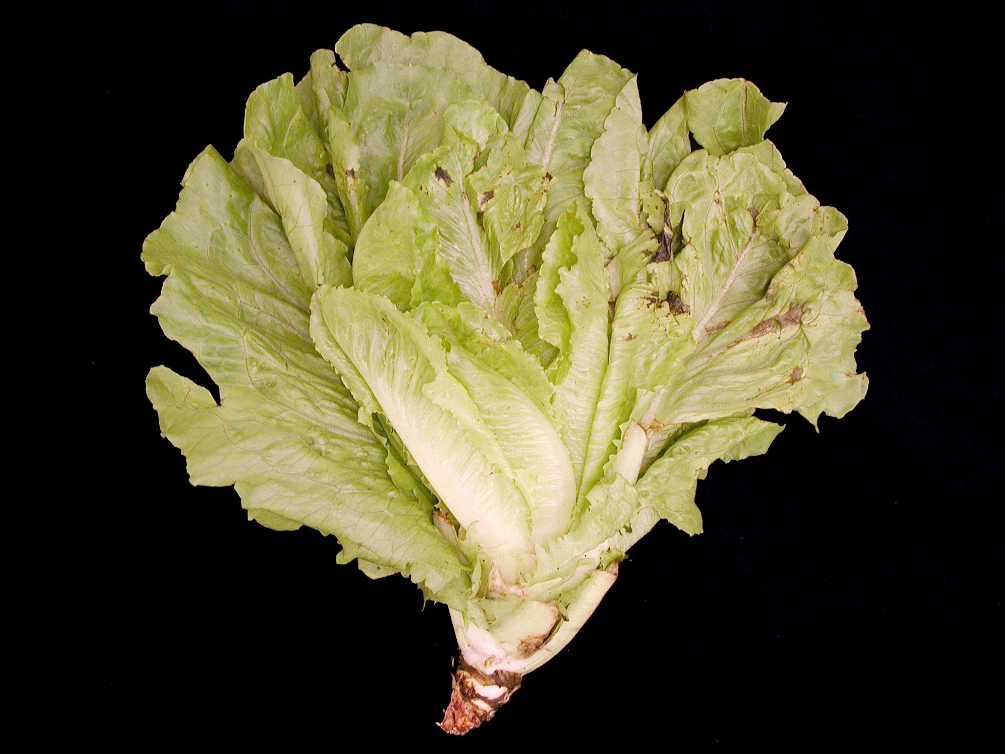 Description: Une laitue romaine montre des taches angulaires brun pâle à brun foncé, plutôt luisantes, sur les feuilles médianes. Les tests de laboratoire ont révélé la présence de la bactérie Pseudomonas cichorii, responsable de la tache luisante chez la laitue.