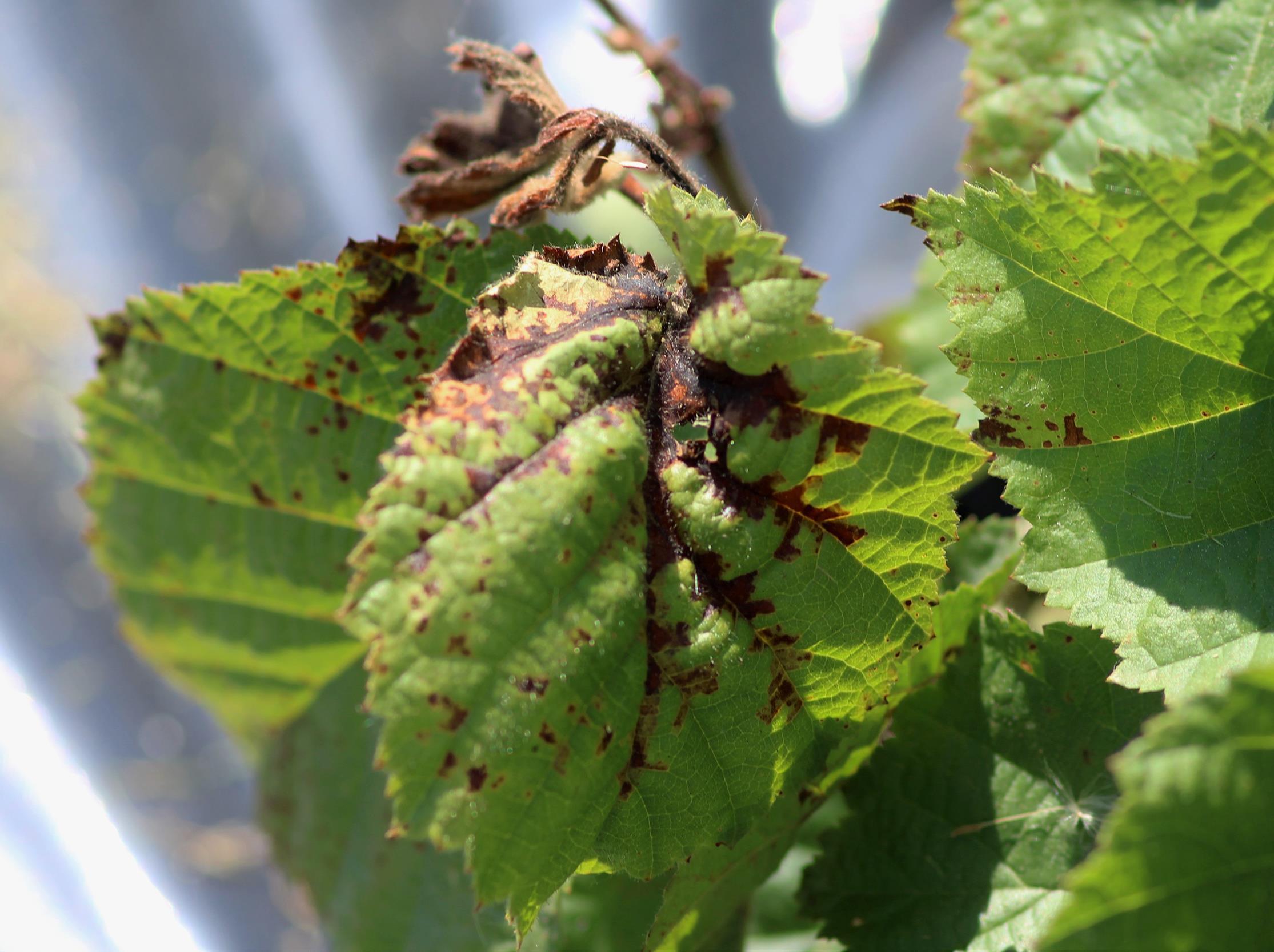 Description: Les taches angulaires brunes à noires sur cette feuille de noisetier se regroupent pour former des zones nécrosées le long des nervures principales.
