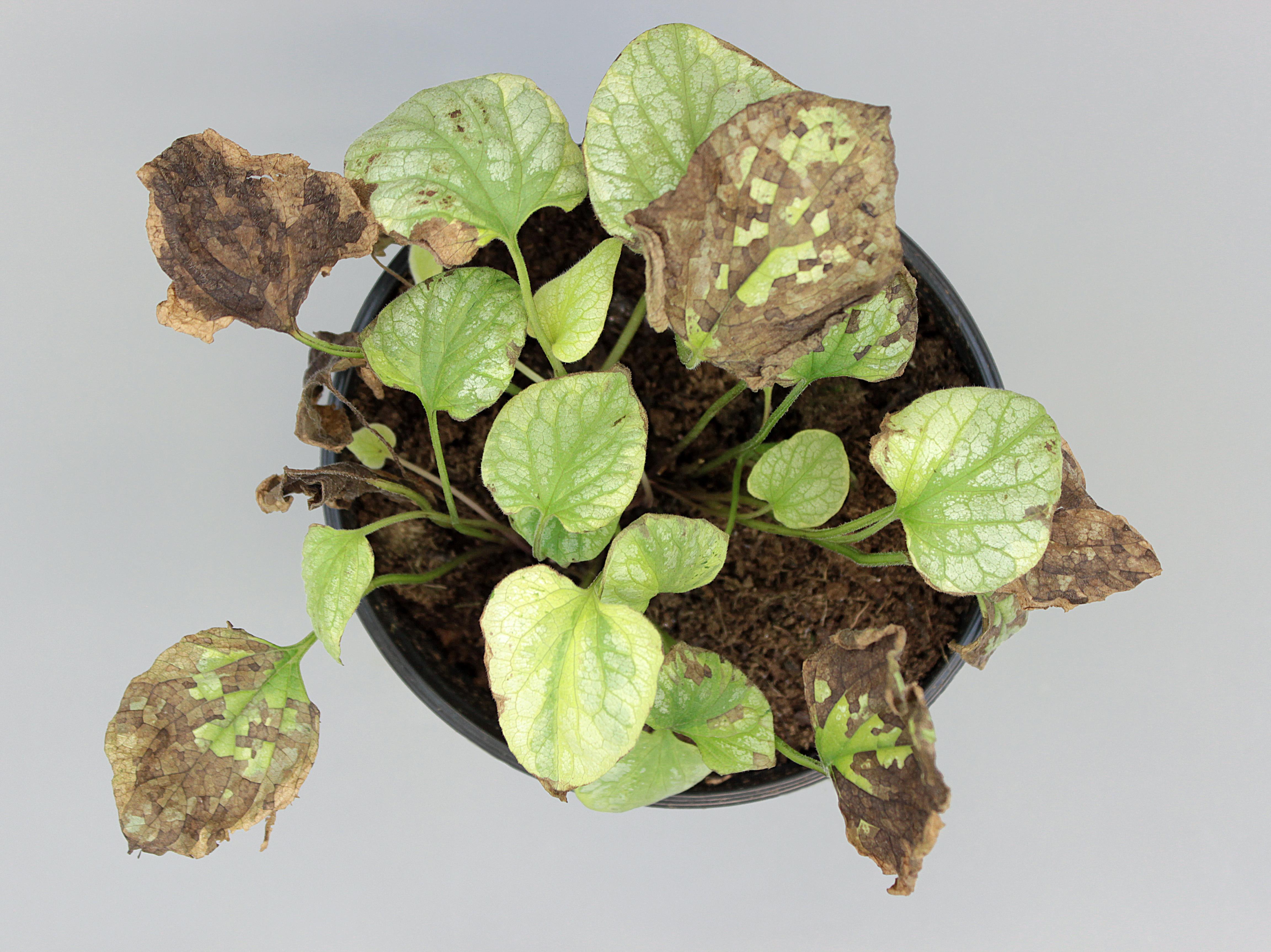 Description: Sur les feuilles médianes d'une brunnère à grandes feuilles, présence de nombreuses taches angulaires brunes et sans halo jaune. Sur les feuilles basales, les taches se regroupent pour former de larges brûlures. Les observations microscopiques ont révélé la présence du nématode foliaire Aphelenchoides sp. En plus du nématode, la bactérie Pseudomonas syringae a été isolée des taches. Ensemble, ils ont causé des dommages plus importants que s’ils avaient agi individuellement.