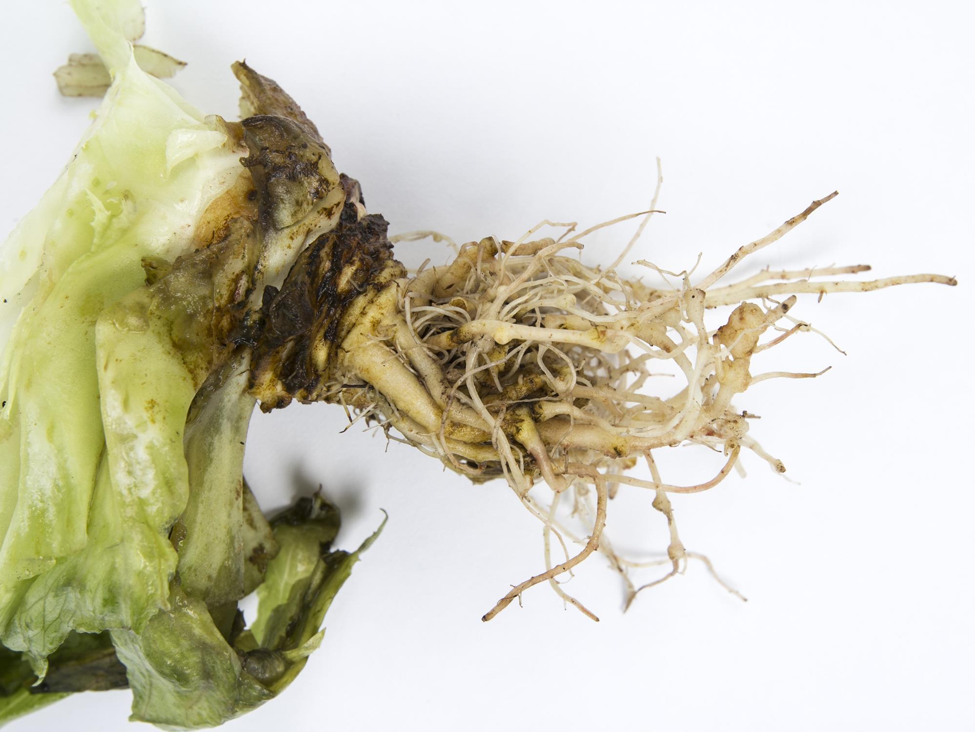 Description: Les racines d’un plant de laitue montrent de petits renflements beiges. Les feuilles basales sont pourries. Les tests de laboratoire ont révélé la présence de 18 nématodes Meloidogyne sp. dans 100 ml de sol. Il s’agit probablement de M. hapla. Ce nématode est responsable de la nodosité des racines. Les plants sont cultivés dans un sol organique.