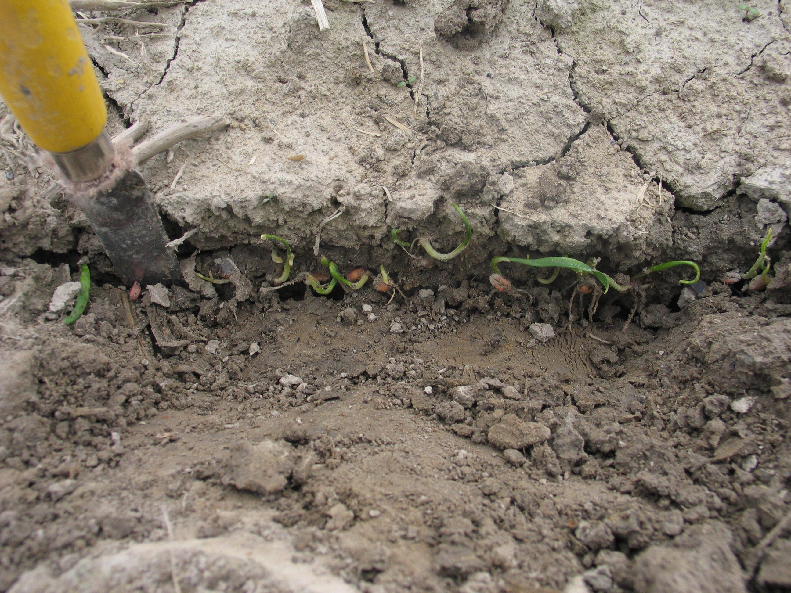 Légende: Émergence difficile des jeunes plants de blé de printemps dans un sol encroûté