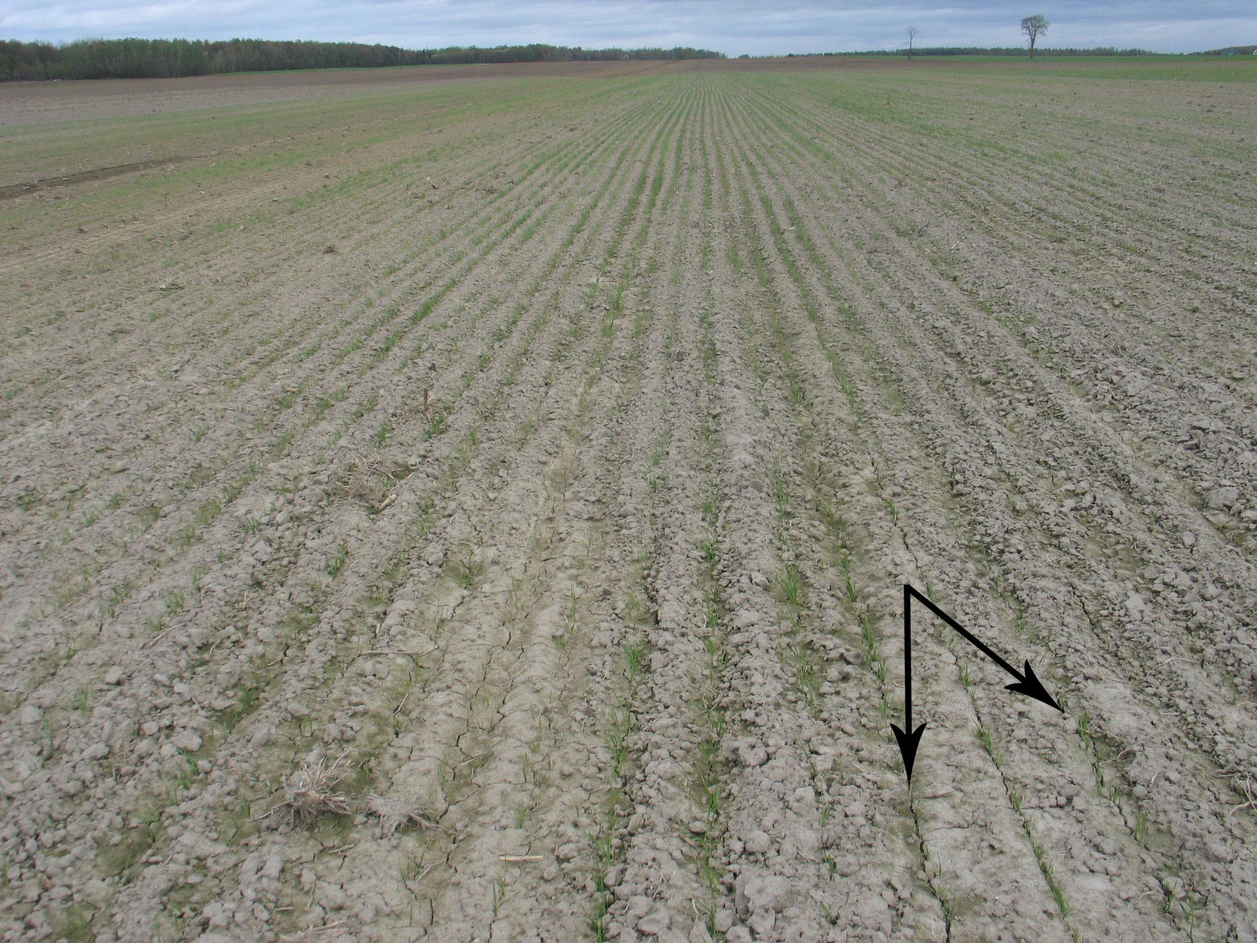 Description: Dans une parcelle de blé de printemps, la population visée est de 450 plants/m2. Le sol est encroûté et les plantules ont de la difficulté à sortir du sol. En essayant de tout sortir du sol en même temps, les plants créent des fissures dans le sol. La base des feuilles se trouve également sous la surface du sol. La levée de ces plants est quand même plus facile que lorsque la population est de 250 plants/m2. À ce stade, les plants sont affaiblis et présentent des malformations foliaires.