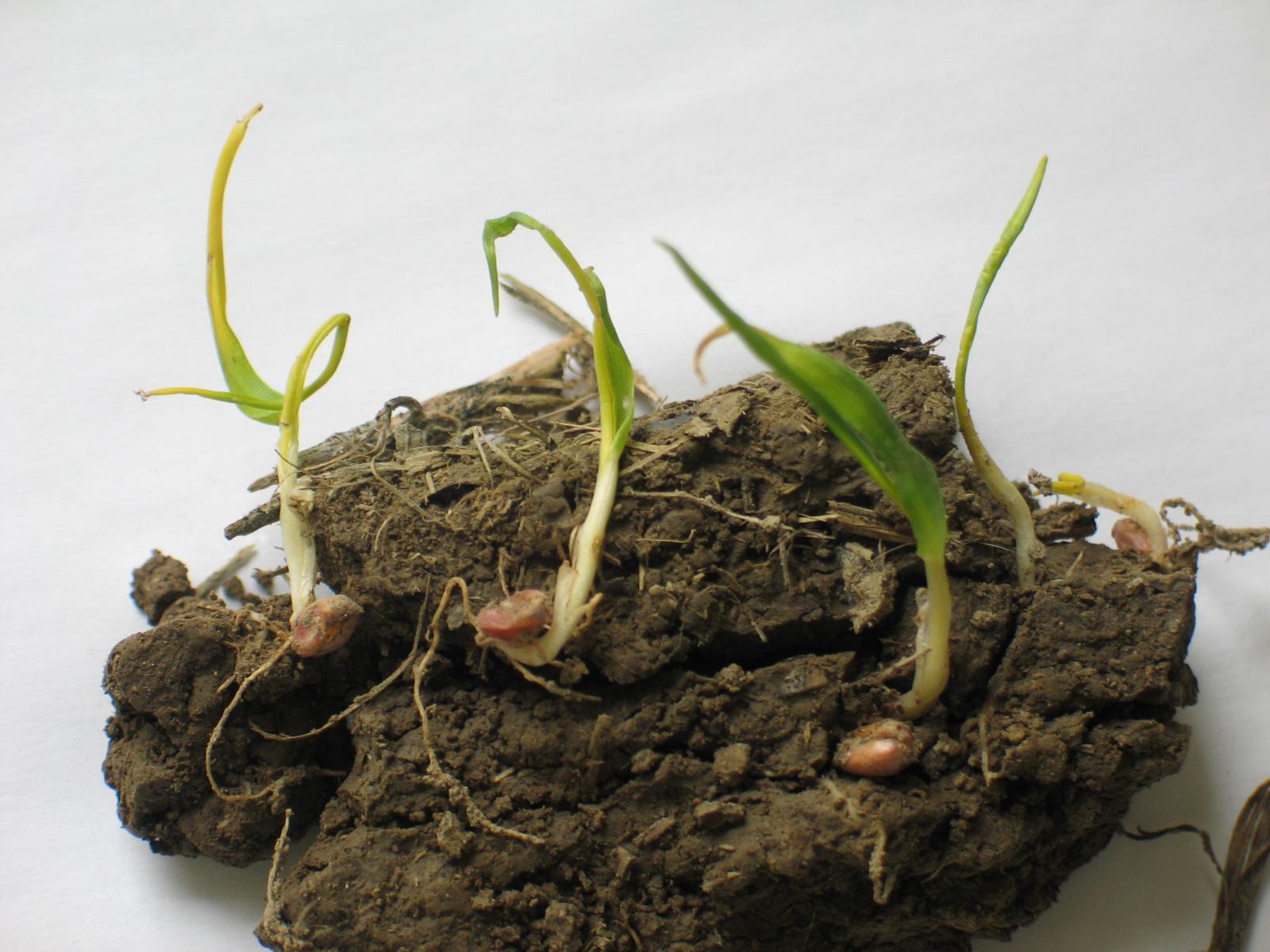 Légende: Jaunissement et déformation de jeunes plants de blé