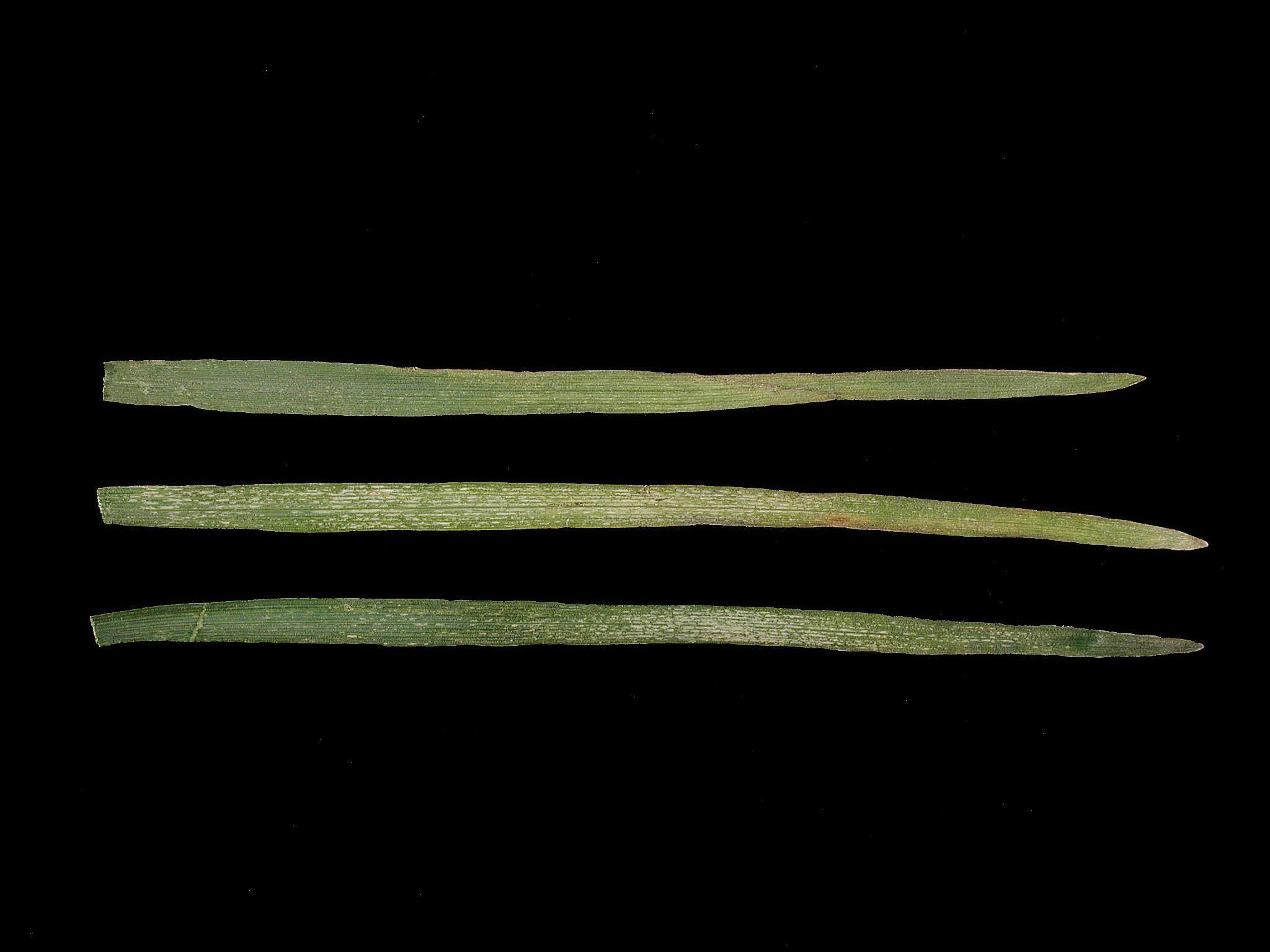 Description: La face supérieure des feuilles de blé de printemps montre de minuscules taches blanches longitudinales concentrées vers l’apex de la feuille. Ces symptômes sont caractéristiques du froid qui a atteint les plantes lors de nuits froides et de matinée ensoleillée. Il y a perte de chlorophylle dans les cellules d’où l’apparition des taches blanches.