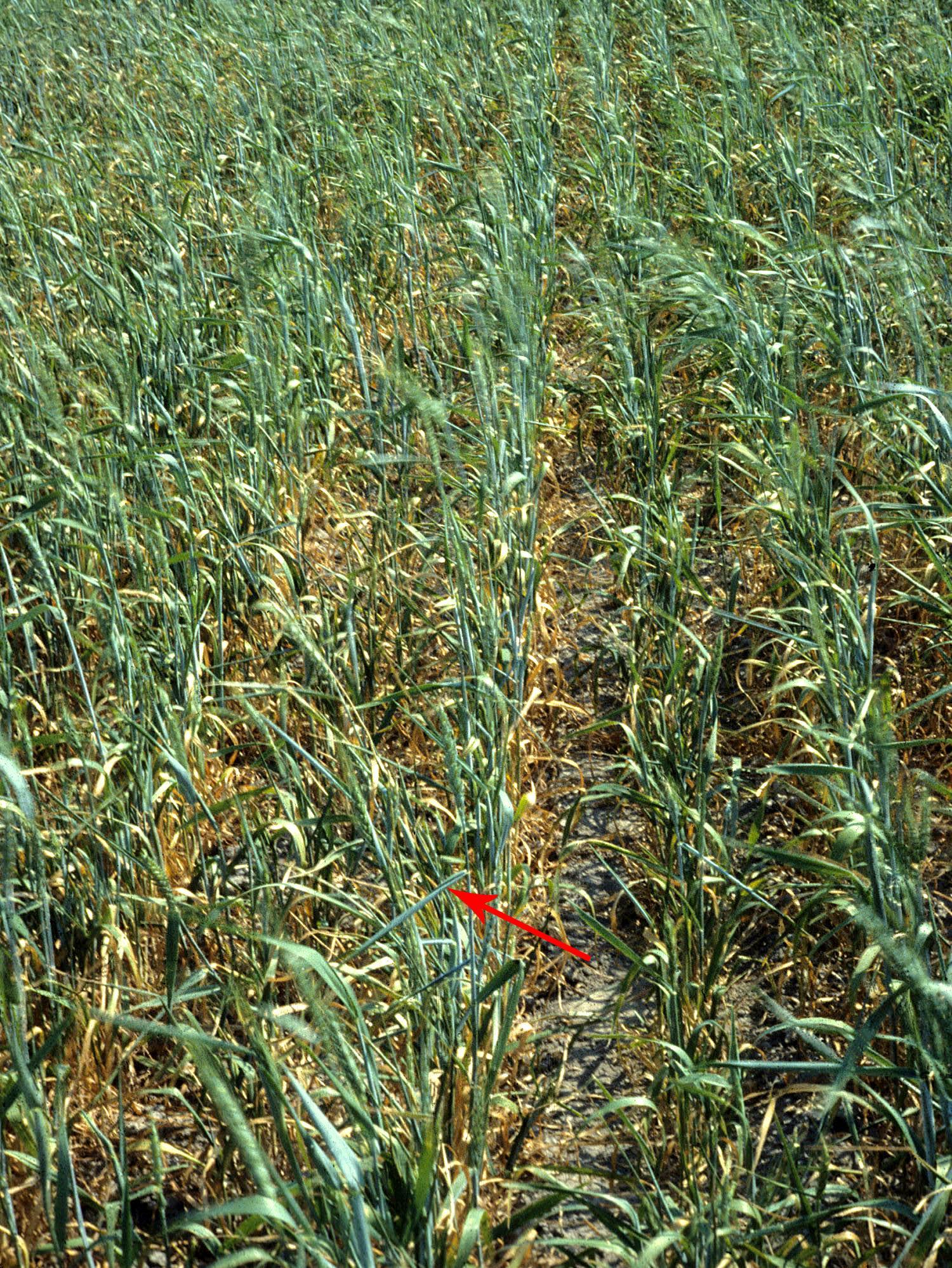 Description: Dans un champ de blé de printemps, les feuilles basales sont jaunies et desséchées tandis que les feuilles médianes et terminales sont flétries et parfois enroulées (voir flèche). Ces symptômes sont causés par le manque d’eau dans le sol occasionné par une très grande sécheresse.