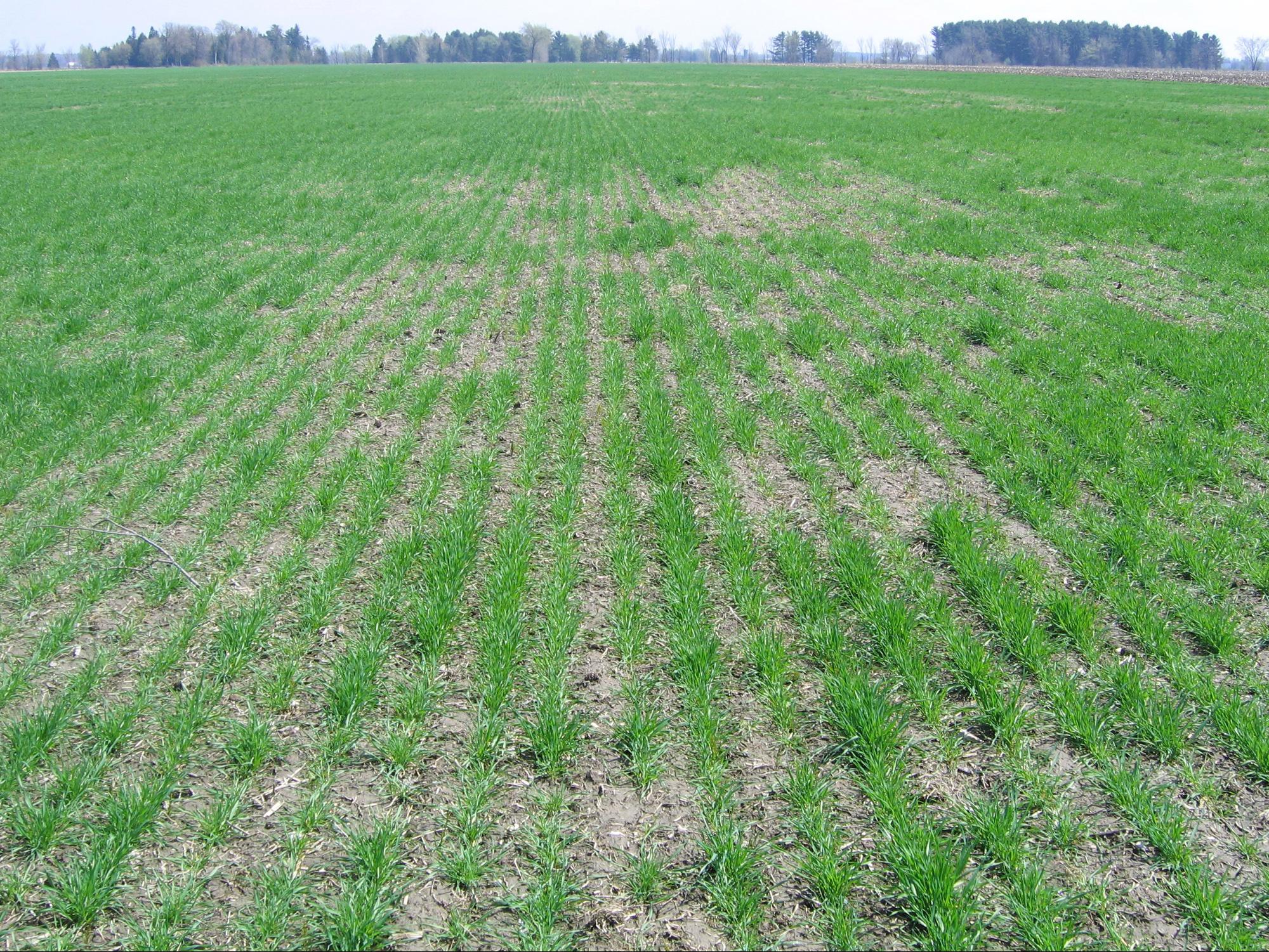 Description: Dans un champ de blé d’automne, des zones dégarnies sont composées de plants qui ont un faible développement ou qui sont desséchés à la suite d’une mauvaise survie à l'hiver. Les zones où les plants sont morts correspondent à de petites baissières où l'eau s'est accumulée et où les plants sont morts par asphyxie par la glace (gel hivernal). Cette culture de blé d'automne a été ensemencée sur un sol nivelé. La photo a été prise au début mai.