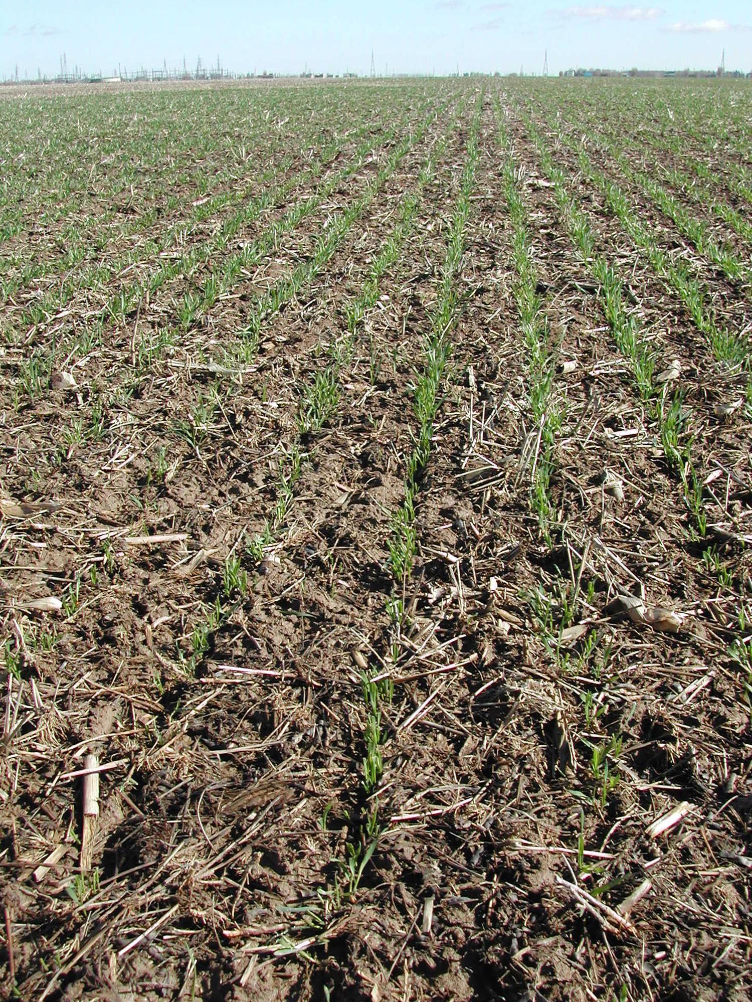 Description: Les rangs de plants de blé de printemps sont clairsemés. Il manque plusieurs plants puisque les semences n’ont pas germé. Un semis fait à la volée a été réalisé sur un sol gelé au printemps. Le faible pouvoir de germination des semences peut être imputé à un lit de semence inadéquat fait sur un sol qui était encore trop gelé.