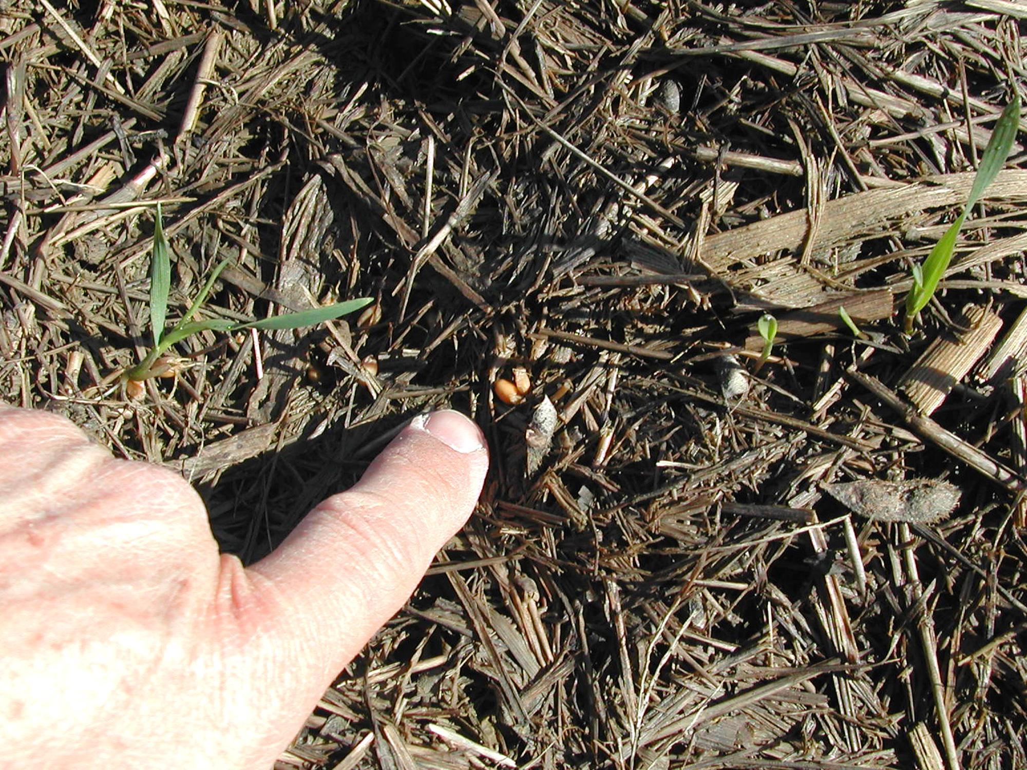 Description: Plusieurs semences de blé de printemps n’ont pas germé. Dans ce champ, un semis fait à la volée a été réalisé sur un sol gelé au printemps. Le faible pouvoir de germination des semences peut être imputé à un lit de semence inadéquat fait sur un sol qui était encore trop gelé.