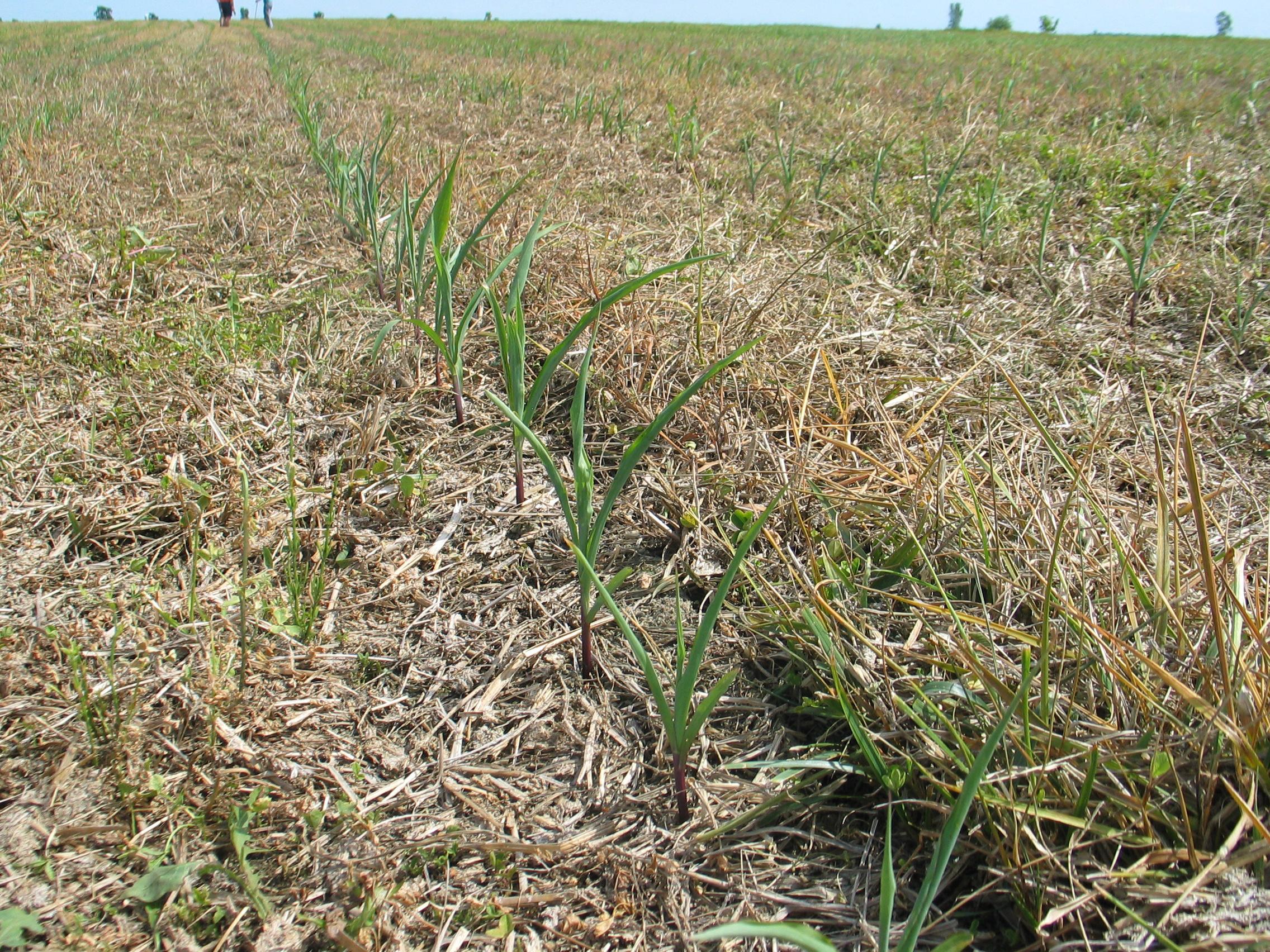 Description: Dans un champ de maïs grain et fourrager en semis direct, les plants montrent des feuilles enroulées. Les racines sont faiblement développées et déformées (non visible ici). En juin, lors d’une longue période chaude et sèche, les plants ont subi un grand stress hydrique imputable à un enracinement insuffisant dû au semis fait dans les résidus de culture et un sol compacté.