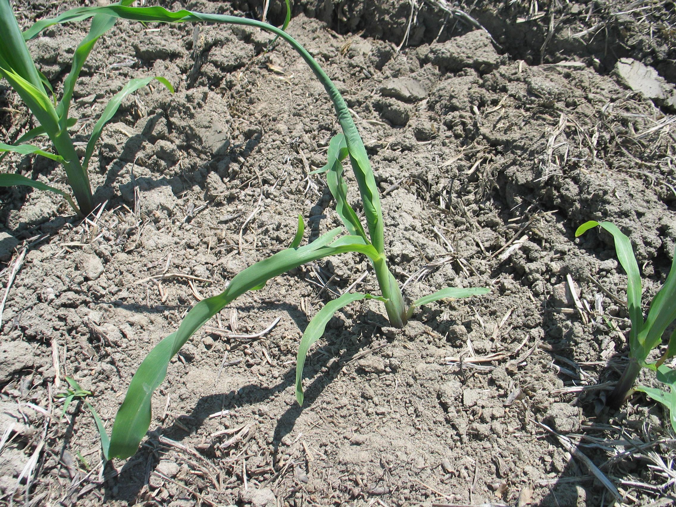 Description: Dans un champ de maïs grain et fourrager en semis direct, les plants montrent des feuilles enroulées. Les racines sont faiblement développées et déformées (non visible ici). Les plants ont subi un grand stress hydrique imputable à un enracinement insuffisant dû au semis fait dans un sol compacté.