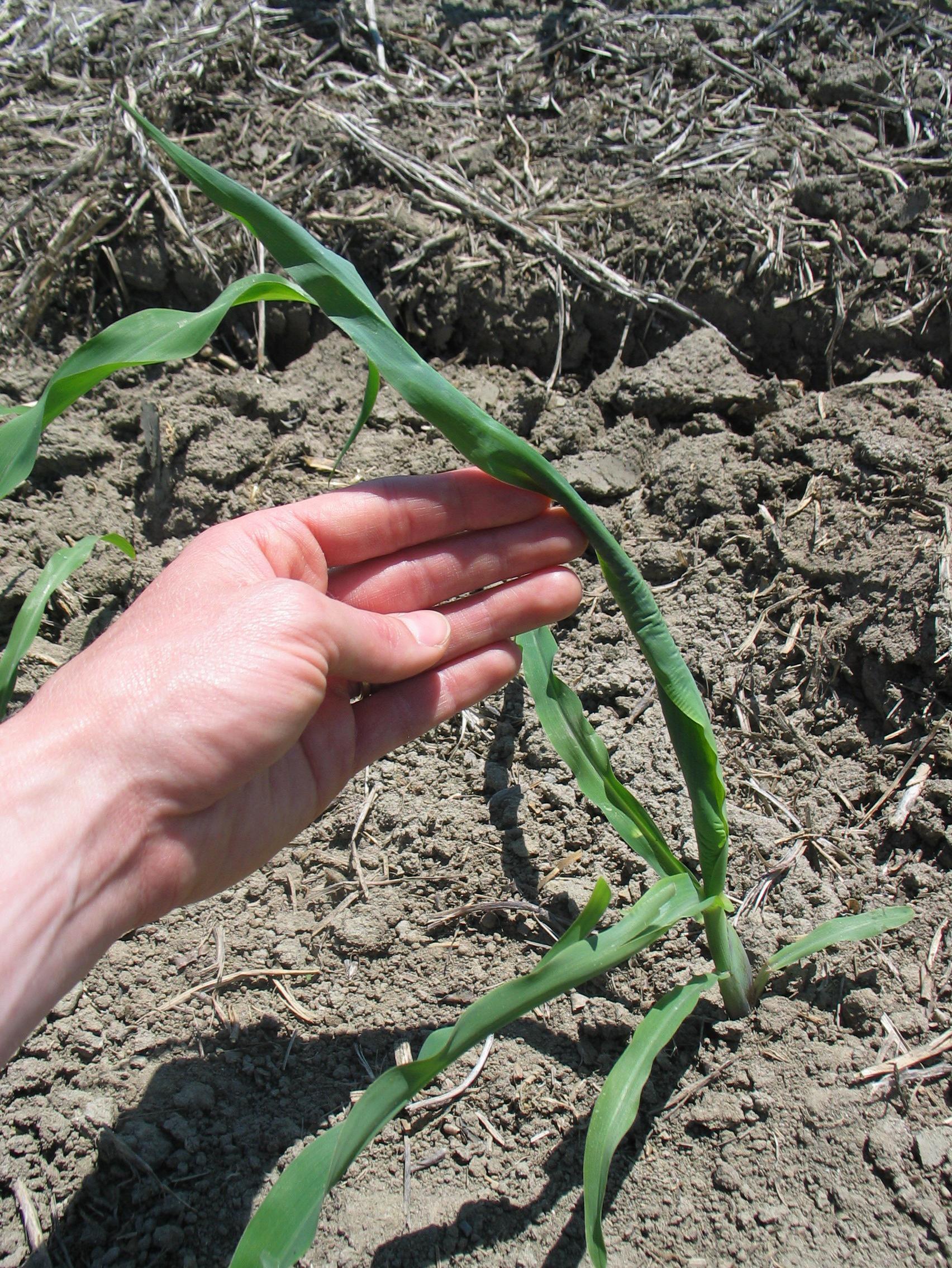 Description: Dans un champ de maïs grain et fourrager en semis direct, un plant montre des feuilles enroulées. Les racines sont faiblement développées et déformées (non visible ici). Le plant a subi un grand stress hydrique imputable à un enracinement insuffisant dû au semis fait dans un sol compacté.