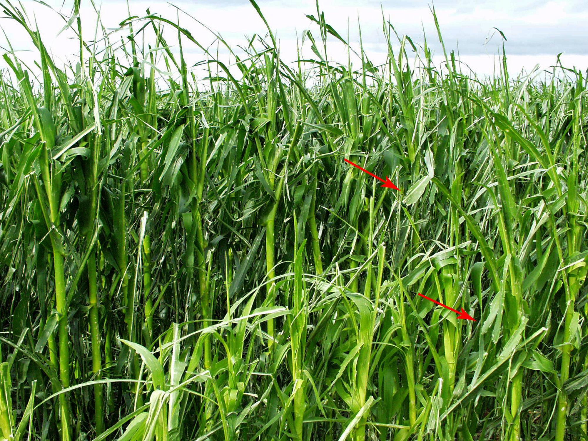 Description: Le limbe de plusieurs feuilles de maïs grain et fourrager s’est déchiré (voir flèches) sous l’impact d’un gros épisode de grêle (juillet 2001). Tous les niveaux de feuilles ont été touchés. Les feuilles lacérées sont réparties aléatoirement dans le champ.