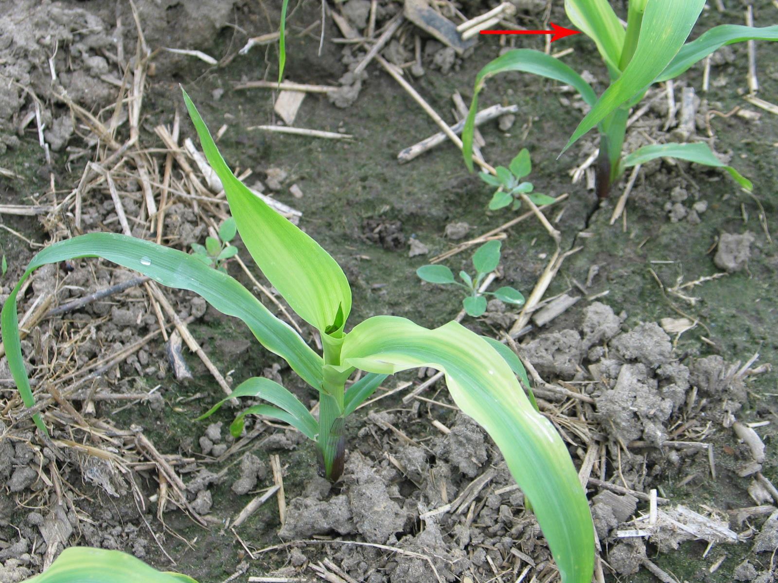 Description: Sur un jeune plant de maïs grain et fourrager, les feuilles médianes montrent une large bande jaunâtre à blanchâtre de chaque côté de la nervure centrale qui demeure verte ou de petites bandes jaunes. Sur le plant en arrière-plan, on observe les mêmes symptômes (voir flèche). Ces symptômes sont caractéristiques de la carence en zinc chez le maïs grain et fourrager.