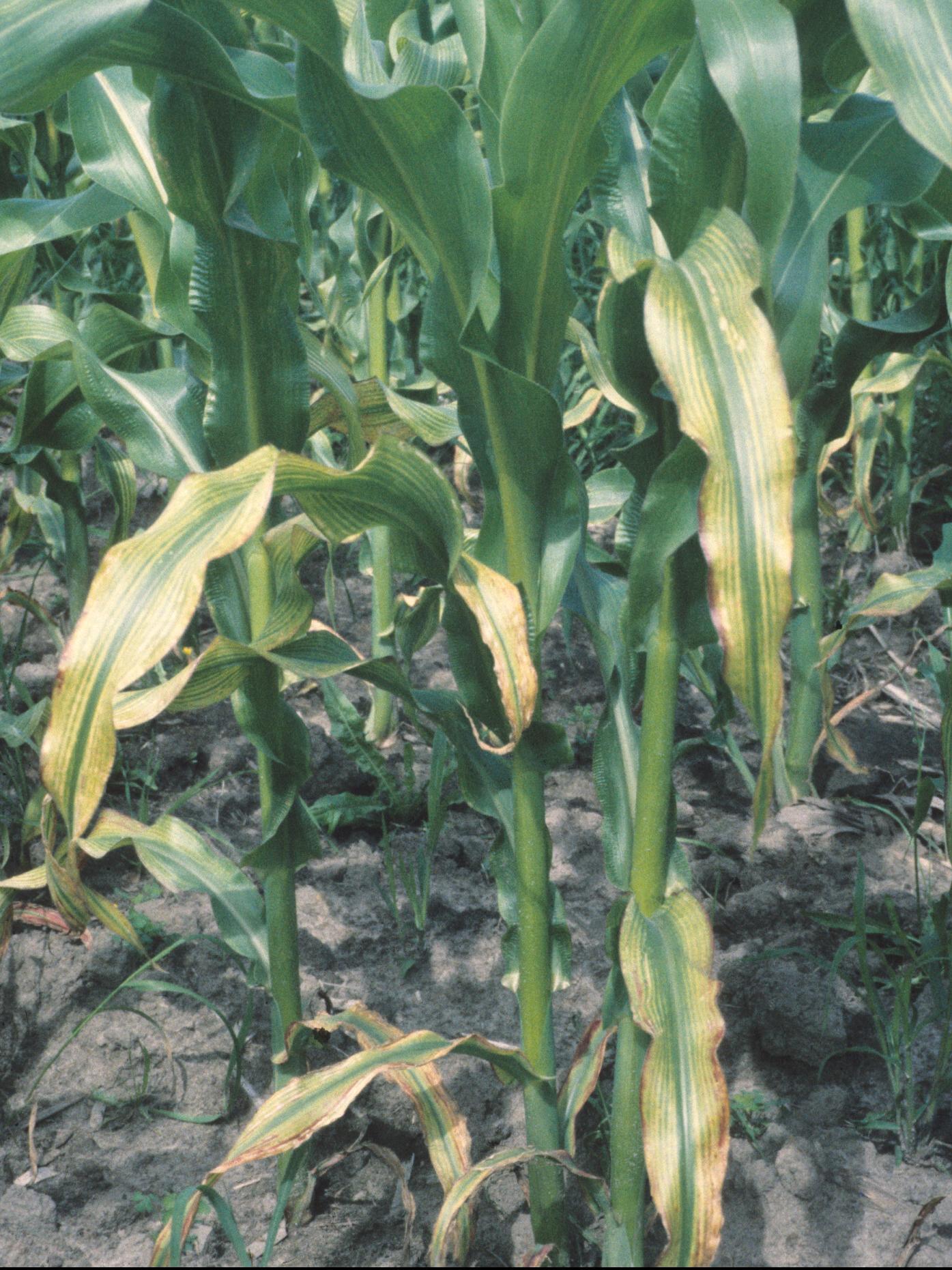Description: Sur de jeunes plants de maïs grain et fourrager, les feuilles basales montrent des stries jaunes à blanches du limbe entre les nervures qui demeurent vertes. Certaines feuilles montrent une marge rouge à pourpre, parfois desséchée. Ces symptômes sont caractéristiques de la carence en magnésium chez le maïs.