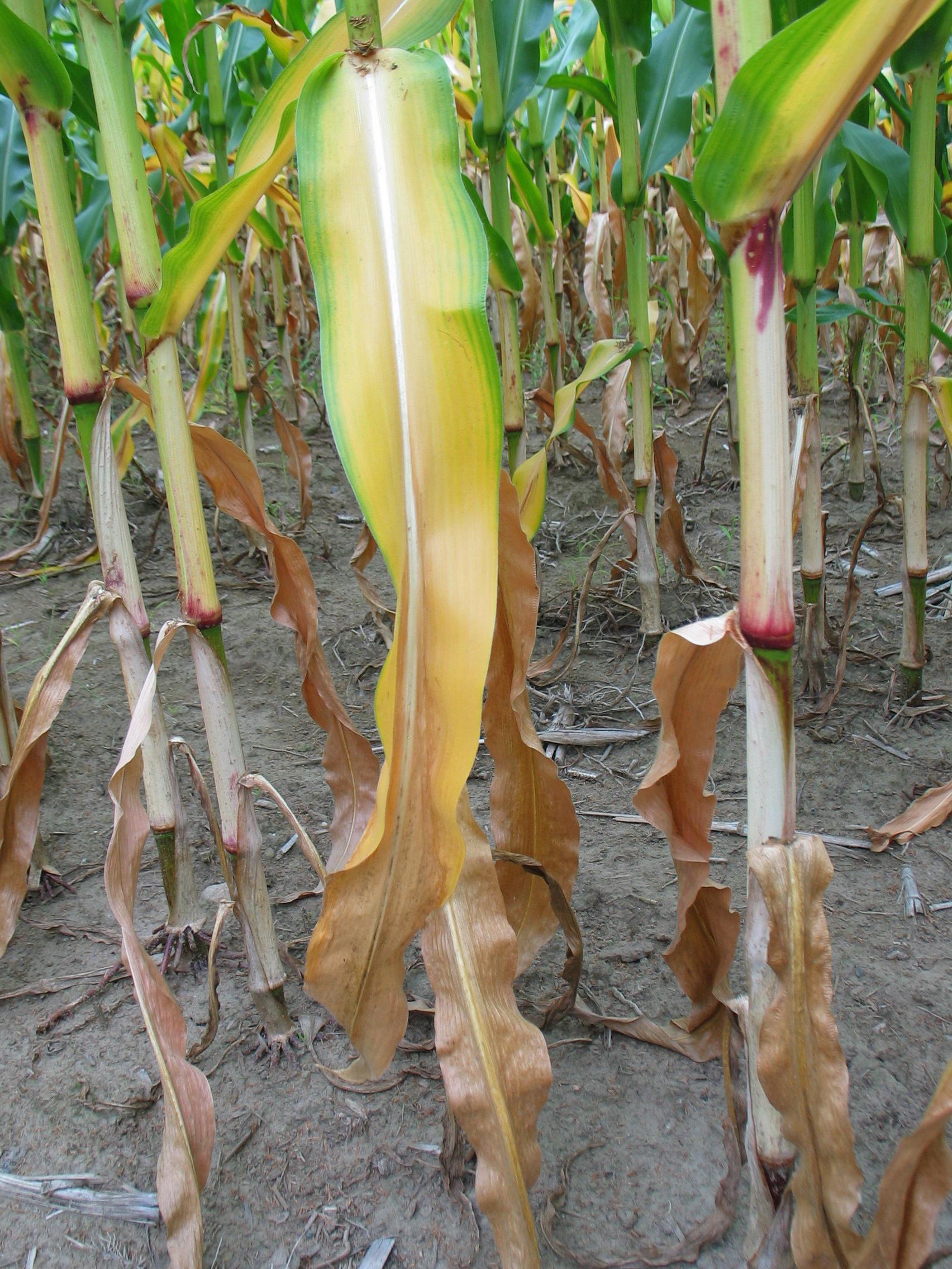 Légende: Jaunissement et dessèchement sur feuilles de maïs grain et fourrager