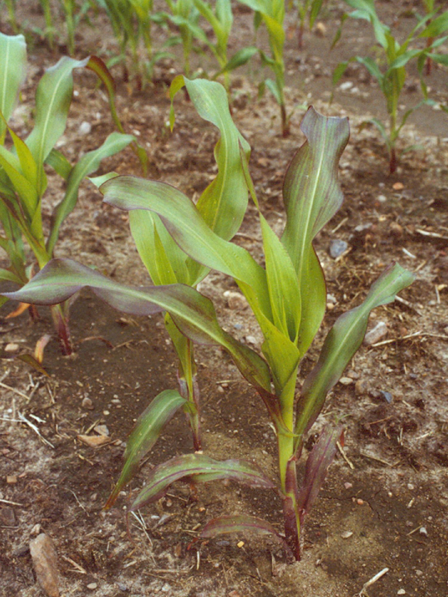 Description: Sur de jeunes plants de maïs grain et fourrager, les feuilles basales et médianes sont vert foncé avec une coloration pourpre débutant à la marge puis progressant sur le limbe. Certaines feuilles sont complètement pourpres. La dernière feuille formée présente une marge pourpre. Ces symptômes sont caractéristiques de la carence en phosphore chez le maïs.