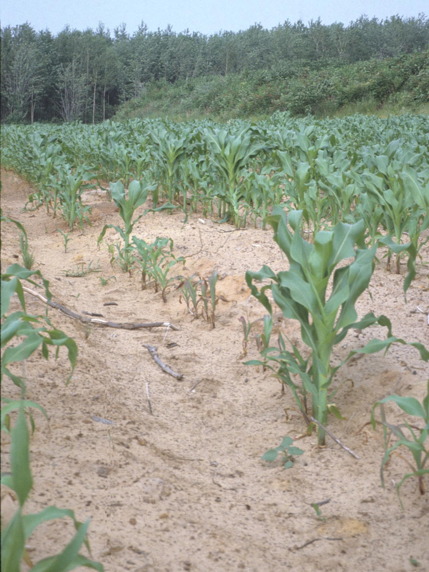 Description: Les feuilles basales des plants de maïs sont pourpres et sur un même rang, une grande variabilité dans la hauteur des plants est observée. La conseillère agricole mentionne que le pH du sol est acide (