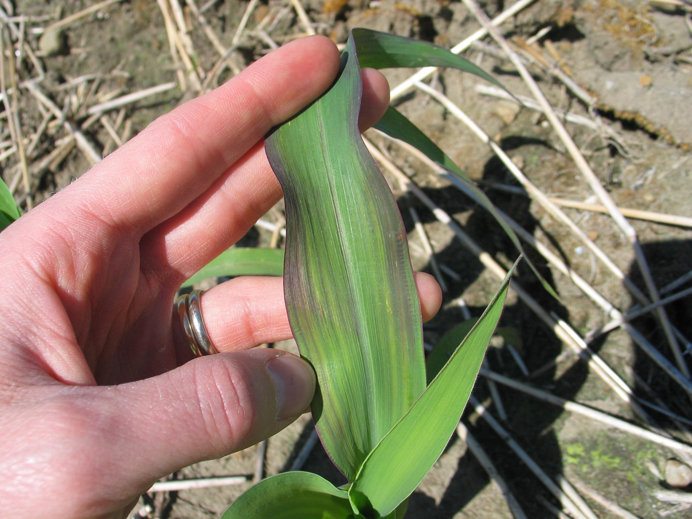 Description: Une feuille basale d’un jeune plant de maïs grain et fourrager au stade 4 à 5 feuilles montre une légère coloration mauve du limbe. Ce symptôme est caractéristique de basses températures de l'air (froid) en début de saison.
