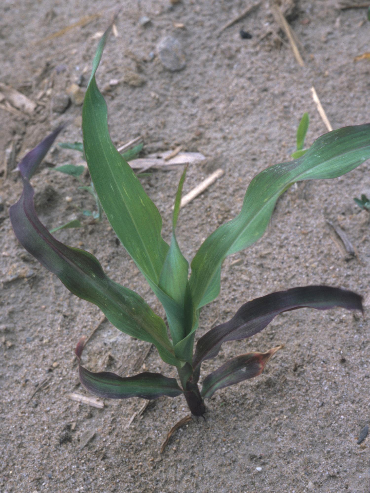 Description: Un jeune plant de maïs grain et fourrager, au stade 6 feuilles, montre différentes intensités de mauve sur les feuilles basales et médianes. Les plus jeunes feuilles sont relativement intactes. Ce symptôme est caractéristique de basses températures de l'air (froid) en début de saison.