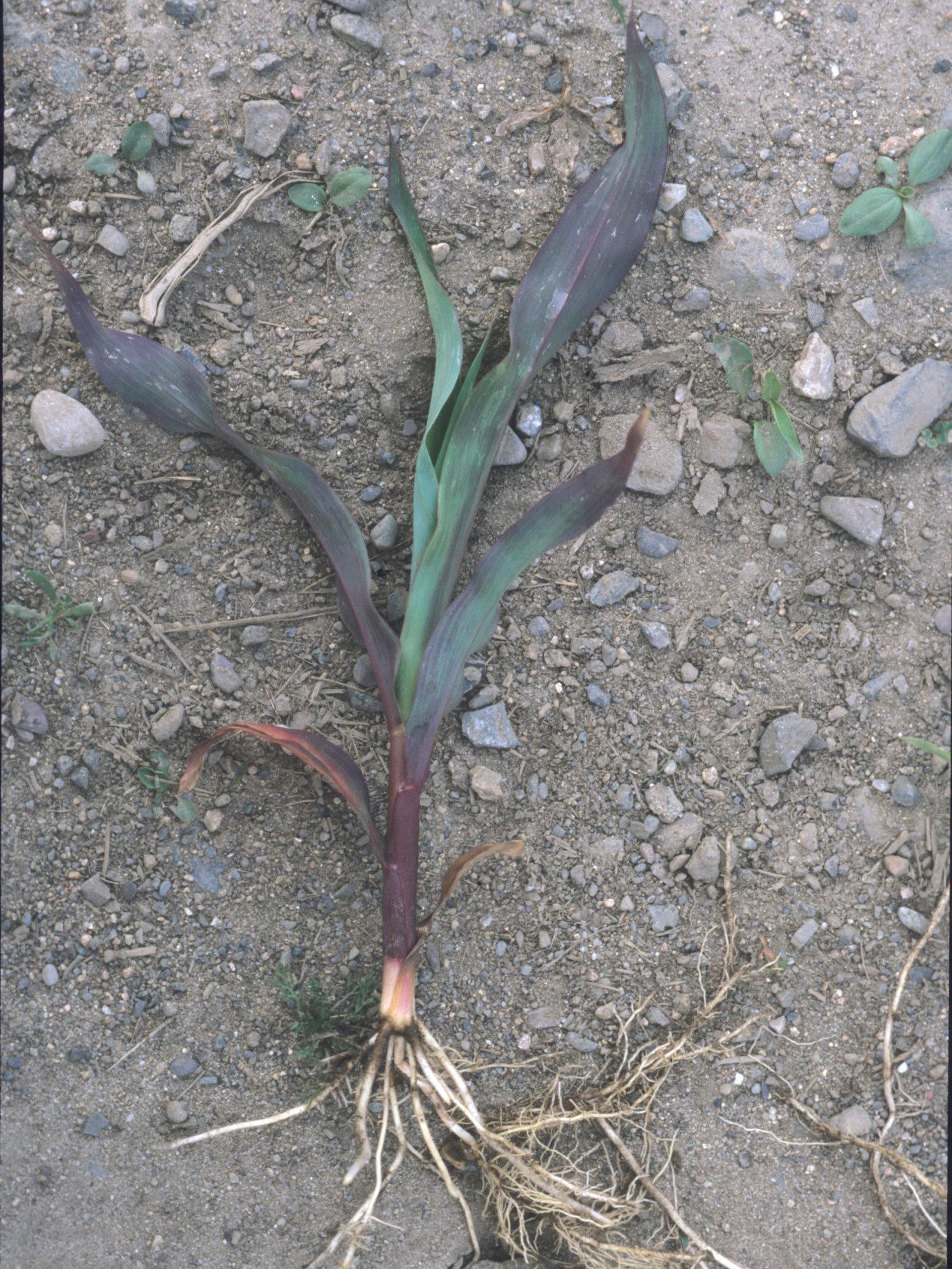 Description: Un jeune plant de maïs grain et fourrager, au stade 6 feuilles, montre différentes intensités de mauve sur les feuilles basales et médianes. Les plus jeunes feuilles sont relativement intactes. Ce symptôme est caractéristique de basses températures de l'air (froid) en début de saison.