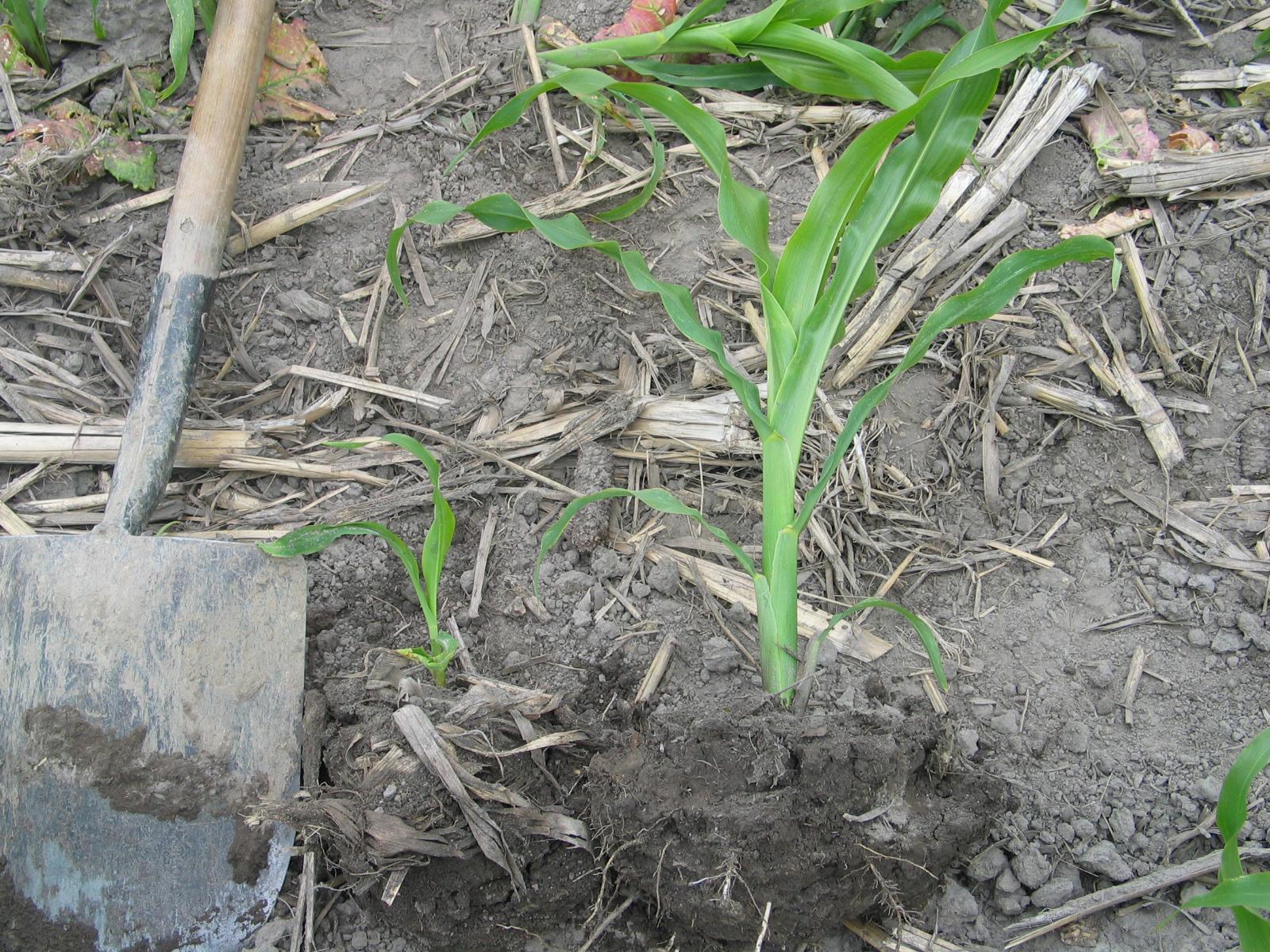 Description: Un plant de maïs grain et fourrager a un faible développement. On constate que la levée est inégale selon la présence ou non de résidus de culture. Le semis a été effectué dans des résidus de maïs à la suite du chisel. La levée inégale des plants est liée à un lit de semence inadéquat.
