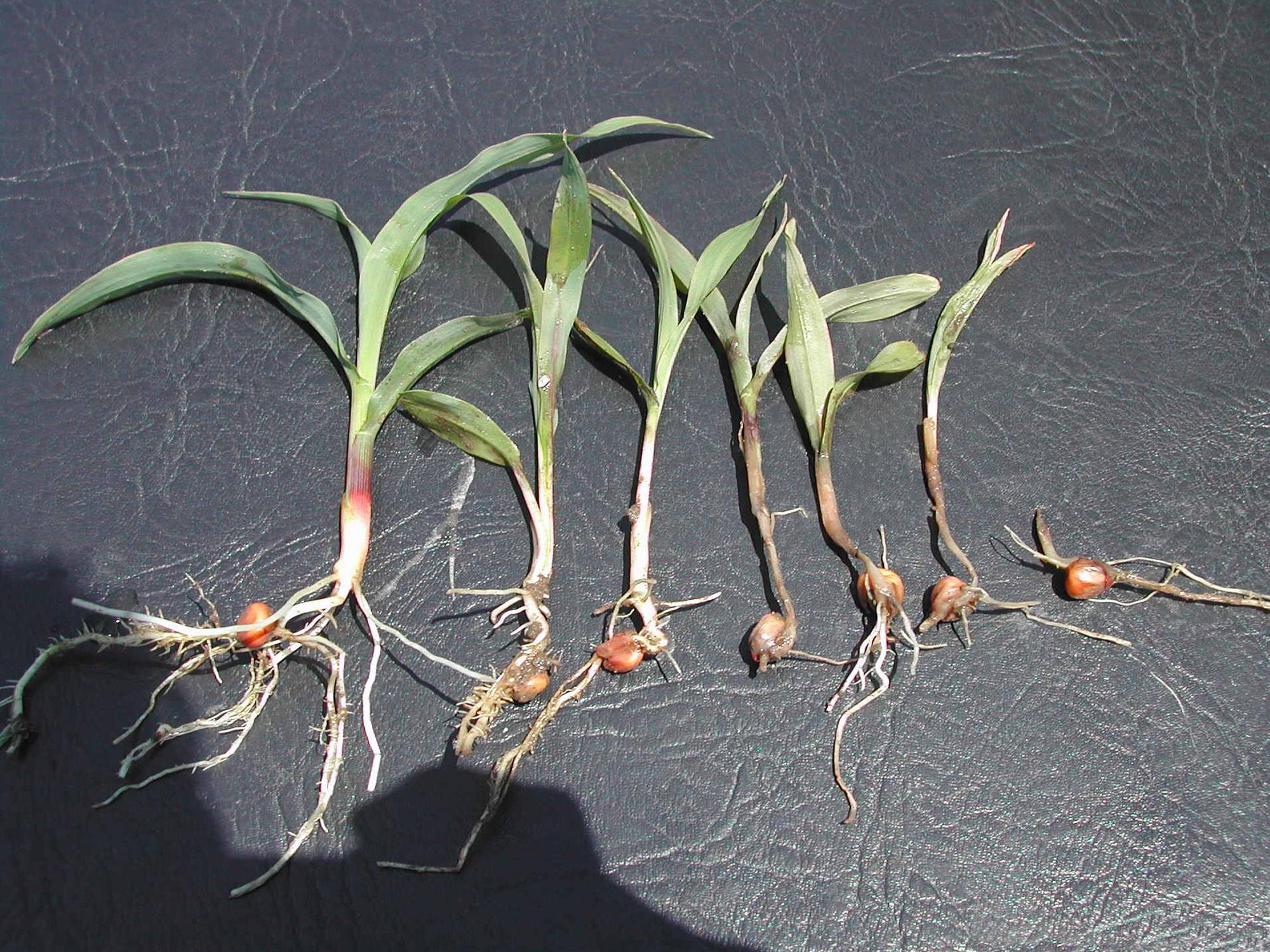 Description: La tige et le collet des quatre plantules de maïs grain et fourrager de droite sont bruns, vitreux et pourris. Leur système racinaire est peu développé et l’apex de quelques racines est noir. Les deux plantules de gauche sont sans symptôme. Le drainage du champ est déficient, ce qui a causé un excès d’eau dans les zones non drainées et favorisé une infection fongique indéterminée.