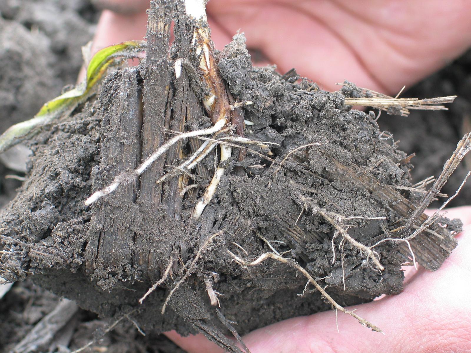 Description: Le développement du système racinaire de ce plant de maïs grain et fourrager est perturbé par la présence de résidus de culture. Le semis a été effectué dans des résidus de maïs à la suite du chisel. La levée inégale des plants est liée à un lit de semence inadéquat.