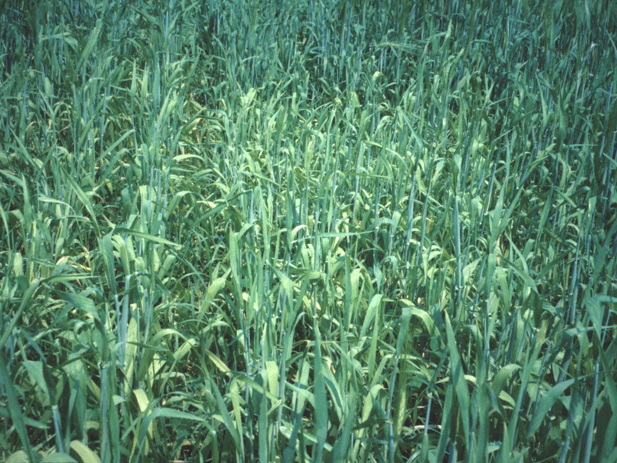 Description: Ce champ d’orge était carencé en manganèse et a été traité avec du sulfate de manganèse (MnSO4) à l’exception de la zone constituée de plants avec un feuillage vert pâle à jaune. Cette zone de plants non traités démontre l’efficacité du sulfate de manganèse sur l’orge carencé.
