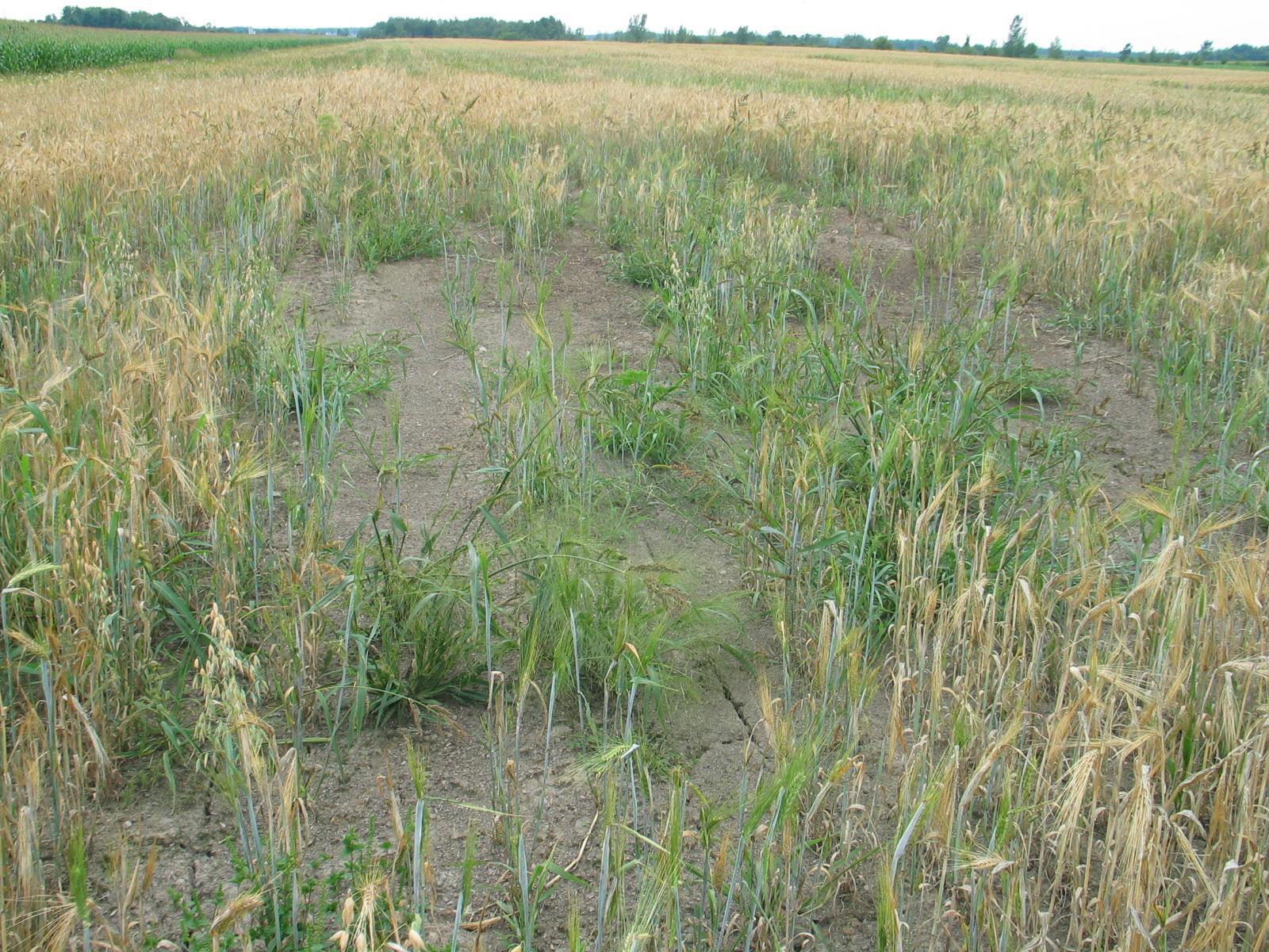 Description: Le 26 juin, ce champ d’orge montrait plusieurs zones de plants vert pâle. Un mois plus tard (31 juillet), l’orge est en train de murir mais il y a encore plusieurs zones de plants verts réparties un peu partout dans le champ. Il y a même des sections du champ qui montrent des zones sans plant et une prolifération importante de mauvaises herbes. Ce champ est un semis direct effectué sur un sol dont le drainage de surface est déficient. Ces plants ont une croissance ralentie et ce retard de croissance peut être relié à une asphyxie racinaire.