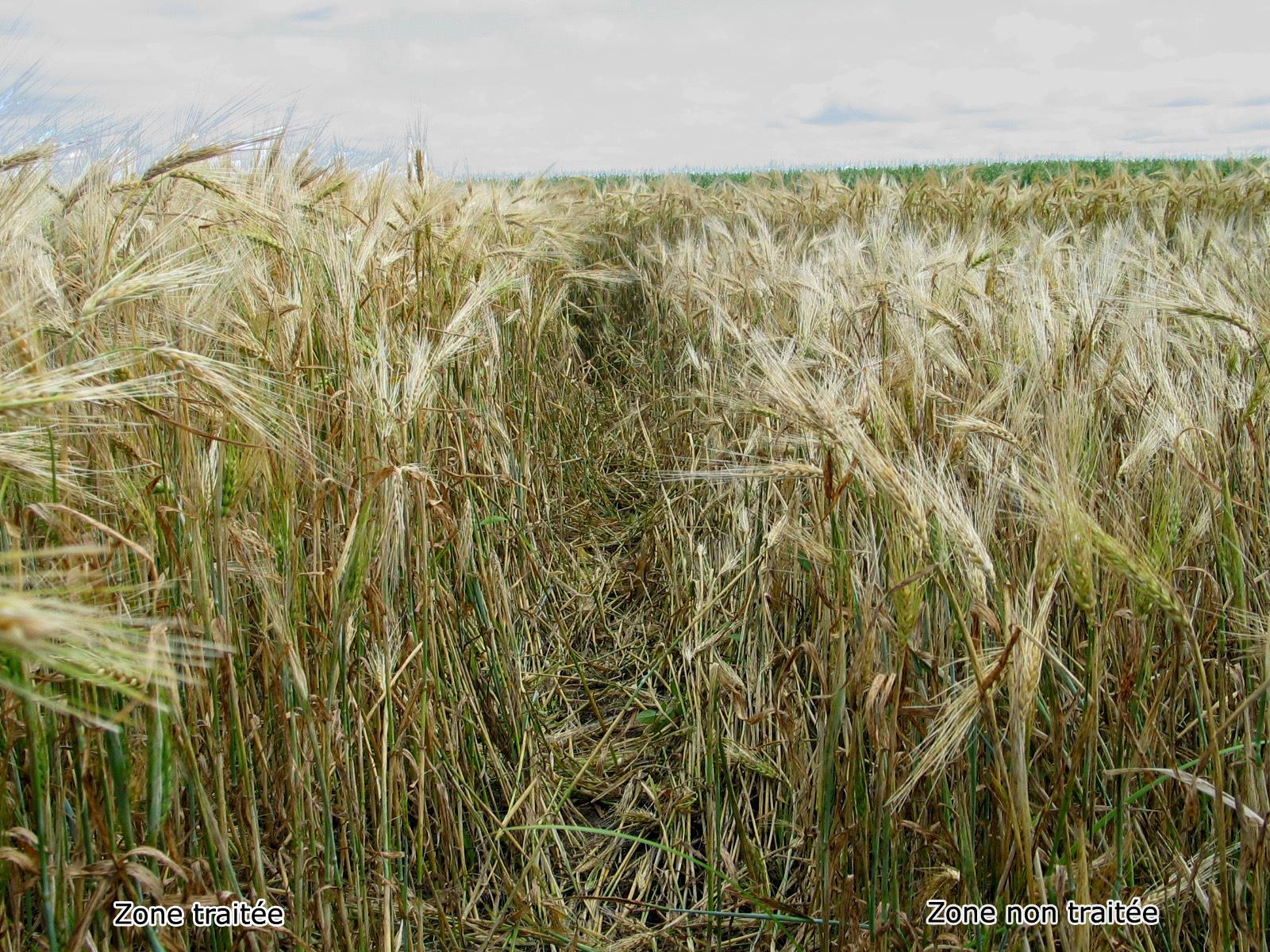 Description: Comparaison entre des plants d’orge (cv 'Klenn') traités avec du sulfate de manganèse (MnSO4) et des plants non traités. Les plants carencés sont plus petits et moins turgescents que ceux traités. L’analyse minérale des tissus foliaires a indiqué une teneur en Mn de 11, 9 ppm et un pH de 7,7. Chez les céréales à paille, le seuil critique pour la carence en Mn est d’environ 10 à 12 ppm pour un pH de 6,0 à 6,5 et de 15 à 18 ppm pour un pH de 6,5 à 7,0. Dans cet échantillon, le pH était de 7,7 et le niveau de Mn était de 11,9 ppm, expliquant l’importante carence en Mn dans ce champ d’orge. Dans ce cas, l’application de sulfate de manganèse a été très rentable, comme en témoigne la différence de rendement entre la partie traitée et non traitée.