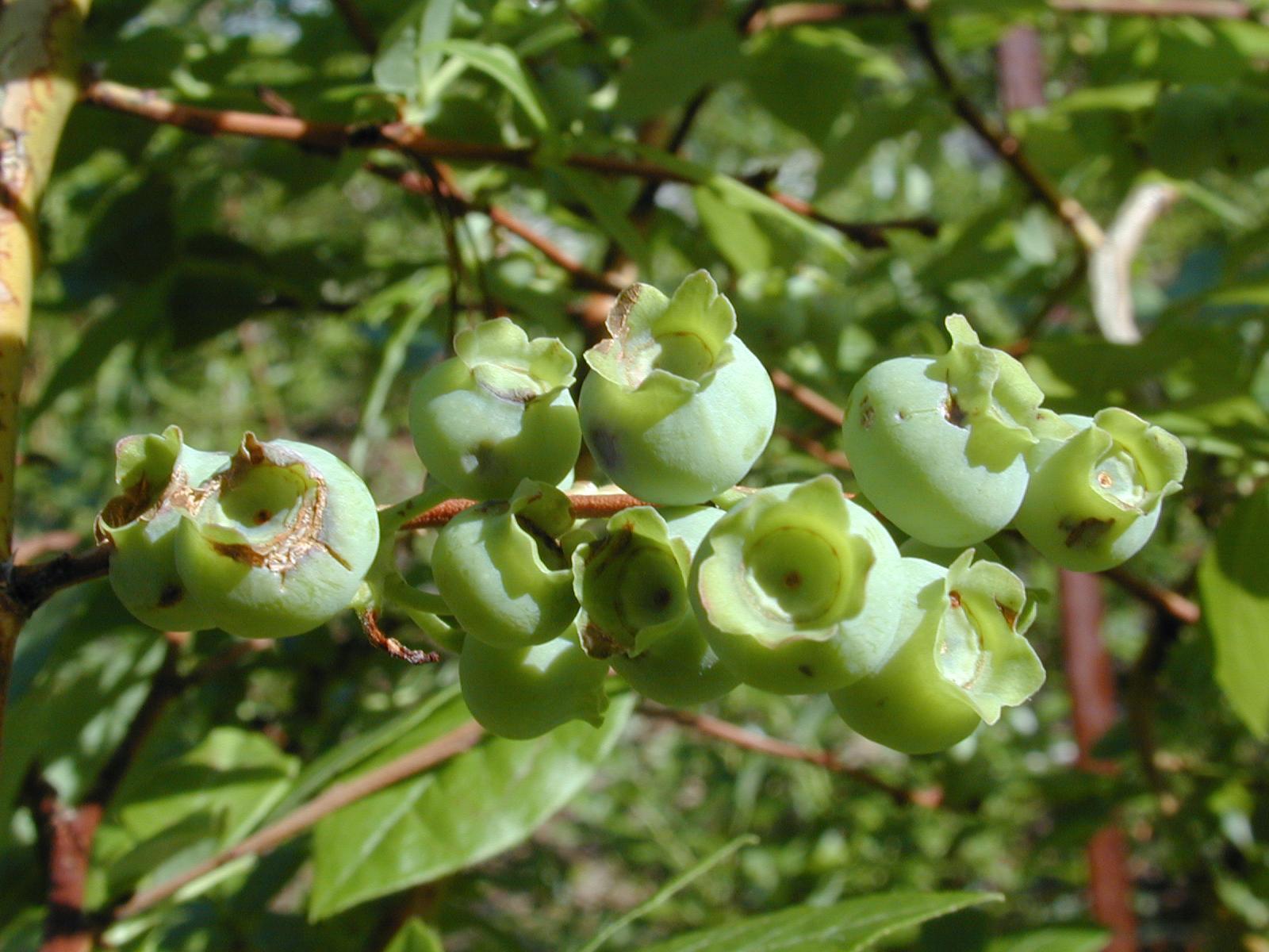 Description: Affaissement de l'épiderme des fruits verts de bleuets en corymbe à la suite d’un épisode de grêle. L’épiderme est déprimé, parfois fendu, et bleuit prématurément. Les symptômes n’évoluent pas. Seule la partie la plus exposée des fruits présente des dommages.