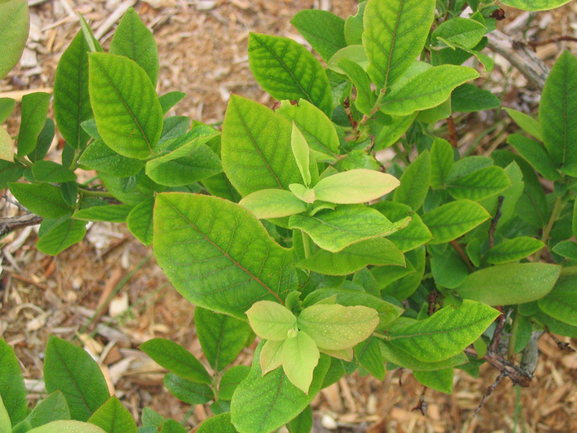 Description: Sur ce plant de bleuet en corymbe, les jeunes feuilles sont jaunes à rose orangé. Les feuilles médianes et basales montrent un jaunissement entre les nervures qui demeurent vertes. Ces symptômes sont caractéristiques d'une carence en fer.