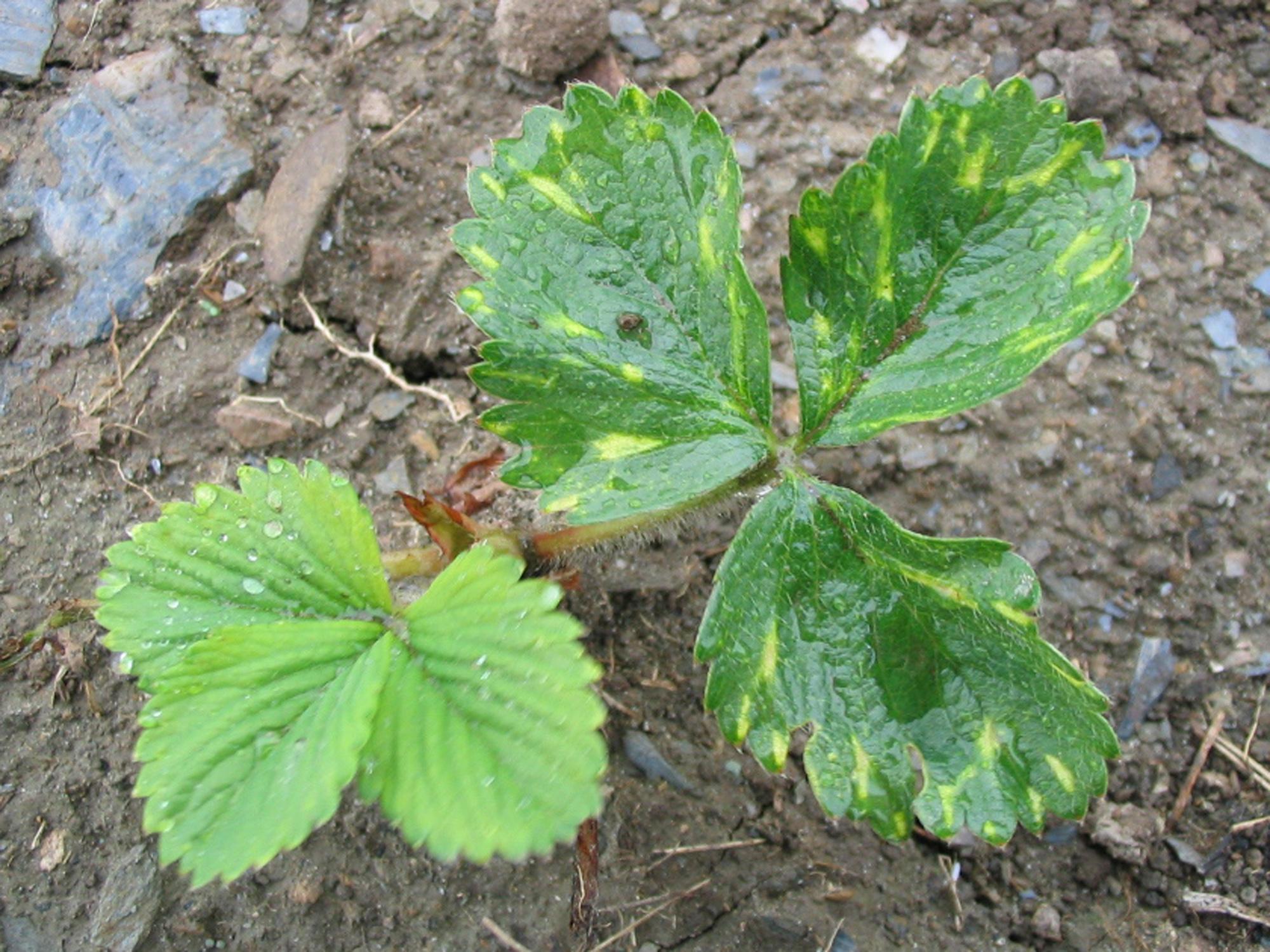Description: Sur de jeunes plants de fraisier (cv 'Darselect') nouvellement transplantés au champ, la vieille feuille montre des taches angulaires jaunes distribuées de manière régulière vers la marge des folioles. La nouvelle feuille formée est sans symptôme. Des conditions climatiques néfastes pourraient être impliquées. Une température froide, combinée à une forte intensité lumineuse, pourrait causer de tels dommages.